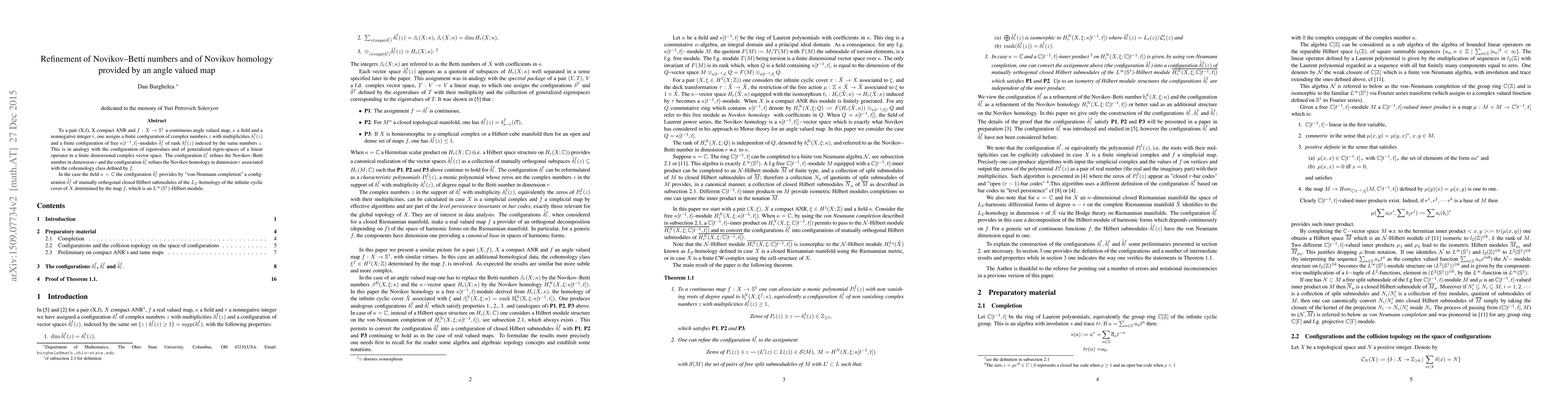 To a pair (X,f), X compact ANR and f a continuous angle valued map defined on X, a fixed field and a nonnegative integer one assigns a finite configuration of complex numbers with multiplicities located in the punctured complex plane and a finite configuration of free modules over the ring of Laurent polynomials (with coefficients in the fixed field) indexed by the same complex numbers. This is done in analogy with the configuration of eigenvalues and of generalized eigenspaces of an invertible linear operator in a finite dimensional complex vector space. The configuration of complex numbers refines the Novikov - Betti number and the configuration of free modules refines the Novikov homology associated with the cohomology class defined by f, in the same way the collection of eigenvalues and of generalized eigen-spaces refine the dimension of the vector space and the vector space on which the operator acts. In the case the field is the field of complex numbers the configuration of free modules induces by "von-Neumann completion" a configuration of mutually orthogonal closed Hilbert submodules of the L 2--homology of the infinite cyclic cover of X determined by the map f, which is an Hilbert module over the von-Neumann algebra of complex L-infinity functions on the unit circle in the complex plane.