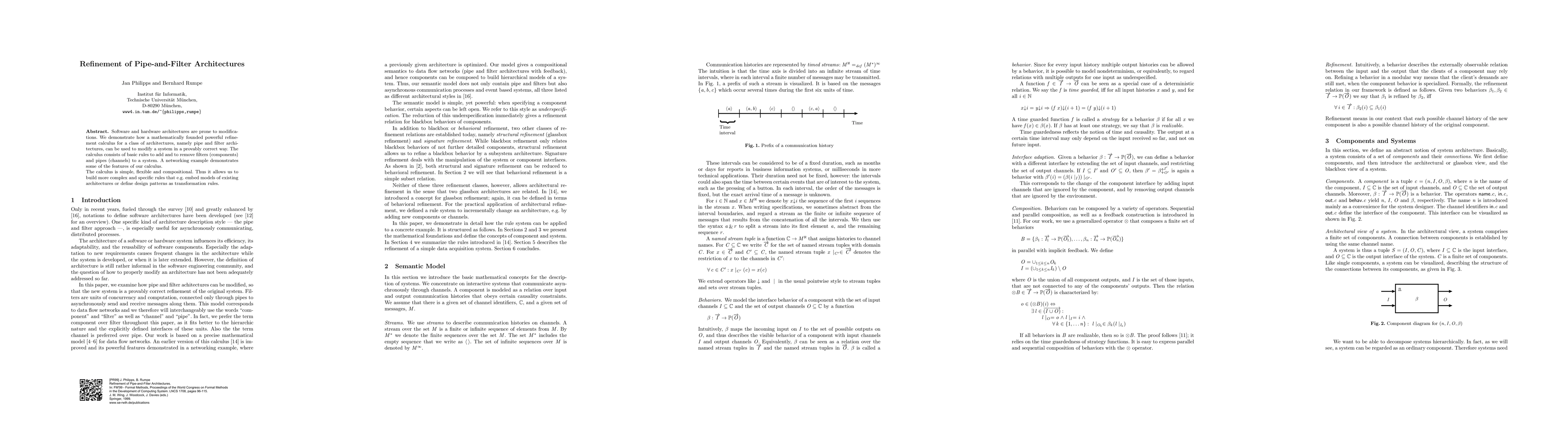 Software and hardware architectures are prone to modifications. We demonstrate how a mathematically founded powerful refinement calculus for a class of architectures, namely pipe and filter architectures, can be used to modify a system in a provably correct way. The calculus consists of basic rules to add and to remove filters (components) and pipes (channels) to a system. A networking example demonstrates some of the features of our calculus. The calculus is simple, flexible and compositional. Thus it allows us to build more complex and specific rules that e.g. embed models of existing architectures or define design patterns as transformation rules.
