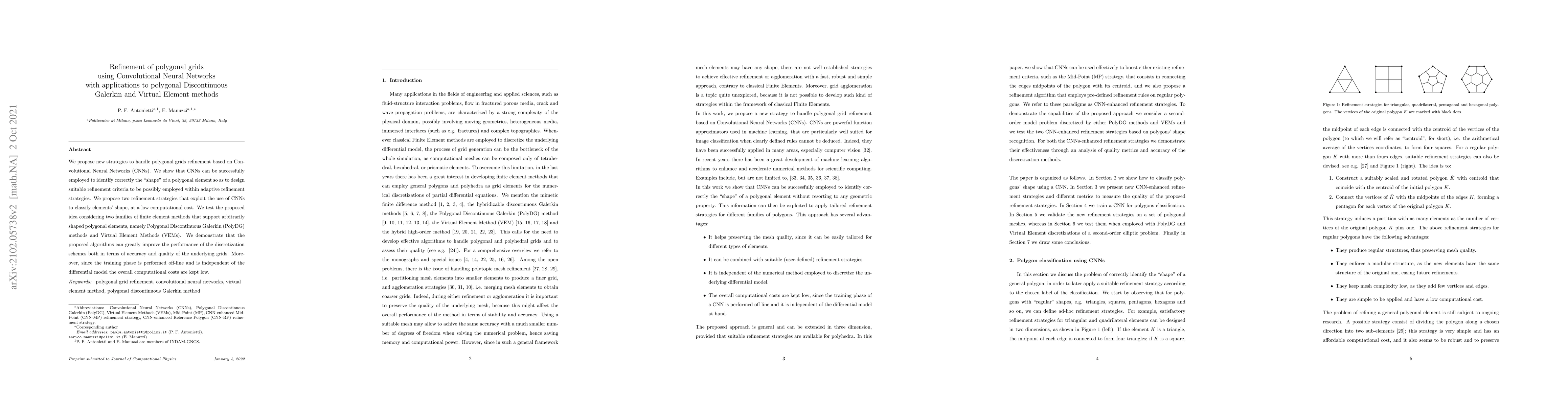 We propose new strategies to handle polygonal grids refinement based on Convolutional Neural Networks (CNNs). We show that CNNs can be successfully employed to identify correctly the "shape" of a polygonal element so as to design suitable refinement criteria to be possibly employed within adaptive refinement strategies. We propose two refinement strategies that exploit the use of CNNs to classify elements' shape, at a low computational cost. We test the proposed idea considering two families of finite element methods that support arbitrarily shaped polygonal elements, namely Polygonal Discontinuous Galerkin (PolyDG) methods and Virtual Element Methods (VEMs). We demonstrate that the proposed algorithms can greatly improve the performance of the discretization schemes both in terms of accuracy and quality of the underlying grids. Moreover, since the training phase is performed off-line and is independent of the differential model the overall computational costs are kept low.
