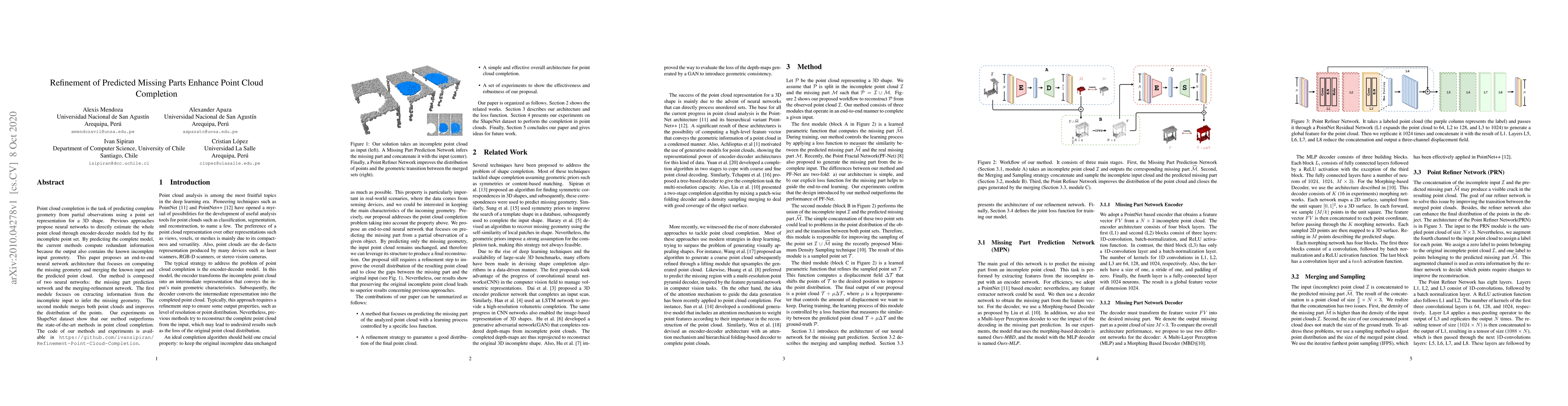 This paper introduces a neural network architecture for point cloud completion that specifically predicts missing parts and refines the merging of known and predicted points, outperforming existing methods on the ShapeNet dataset. The proposed approach uses two networks: one for predicting missing geometry and another for merging and refining the point clouds.