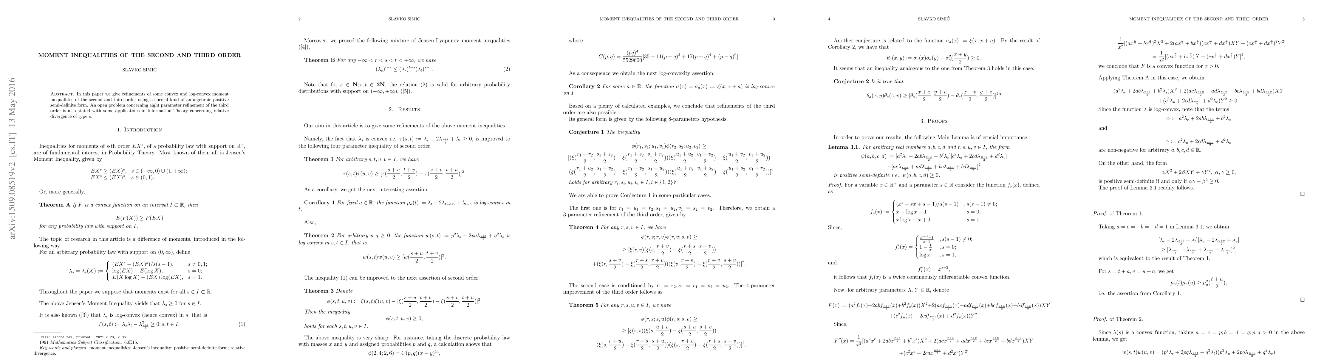 In this paper we give refinements of some convex and log-convex moment inequalities of the first and second order using a special kind of positive semi-definite form. An open problem concerning eight parameter refinement of second order is also stated with some applications in Information Theory.