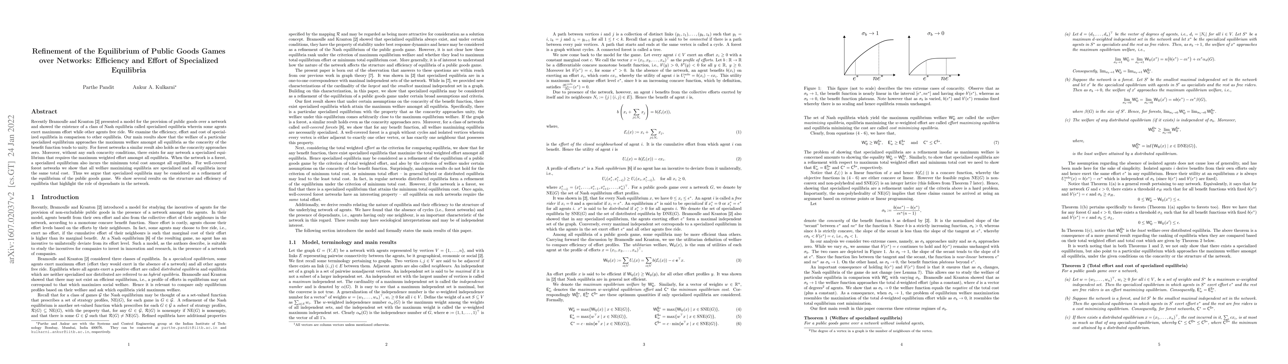 Recently Bramoulle and Kranton presented a model for the provision of public goods over a network and showed the existence of a class of Nash equilibria called specialized equilibria wherein some agents exert maximum effort while other agents free ride. We examine the efficiency, effort and cost of specialized equilibria in comparison to other equilibria. Our main results show that the welfare of a particular specialized equilibrium approaches the maximum welfare amongst all equilibria as the concavity of the benefit function tends to unity. For forest networks a similar result also holds as the concavity approaches zero. Moreover, without any such concavity conditions, there exists for any network a specialized equilibrium that requires the maximum weighted effort amongst all equilibria. When the network is a forest, a specialized equilibrium also incurs the minimum total cost amongst all equilibria. For well-covered forest networks we show that all welfare maximizing equilibria are specialized and all equilibria incur the same total cost. Thus we argue that specialized equilibria may be considered as a refinement of the equilibrium of the public goods game. We show several results on the structure and efficiency of equilibria that highlight the role of dependants in the network.
