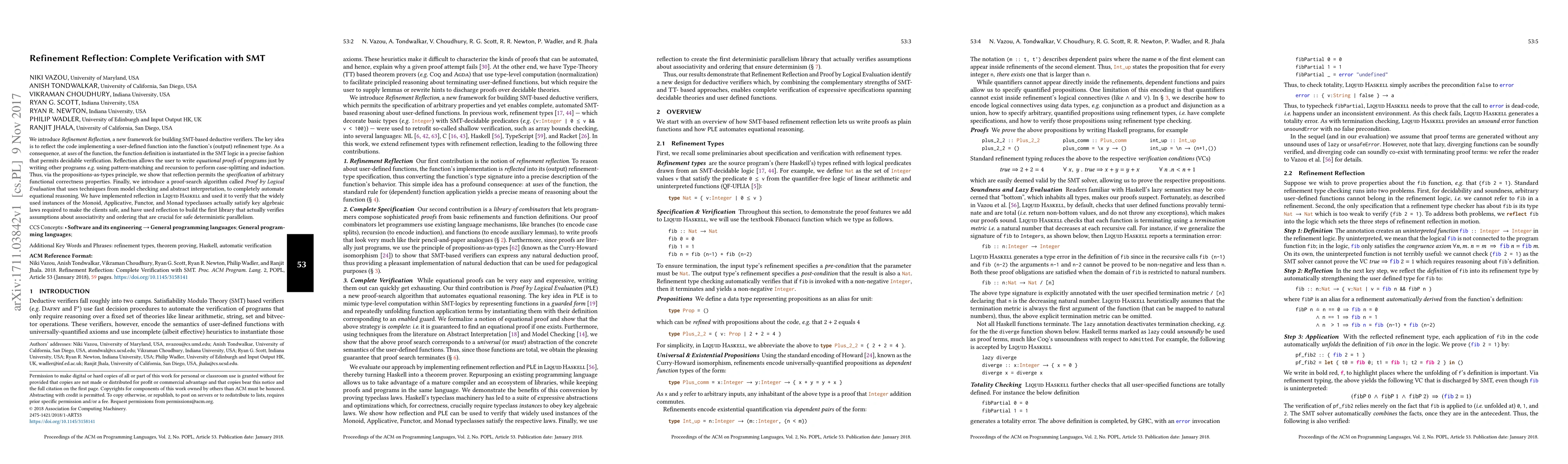 This paper introduces Refinement Reflection, a framework for SMT-based deductive verification that reflects code into refinement types, enabling precise verification. It automates equational reasoning with a proof-search algorithm, and has been implemented in Liquid Haskell to verify functional correctness properties and algebraic laws in typeclasses.