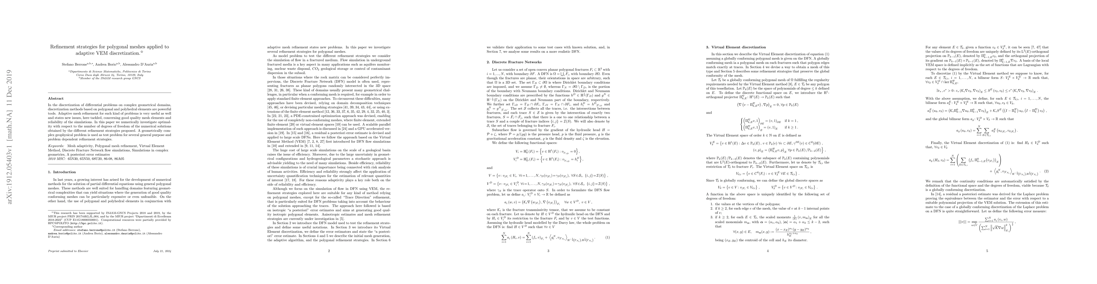 In the discretization of differential problems on complex geometrical domains, discretization methods based on polygonal and polyhedral elements are powerful tools. Adaptive mesh refinement for such kind of problems is very useful as well and states new issues, here tackled, concerning good quality mesh elements and reliability of the simulations. In this paper we numerically investigate optimality with respect to the number of degrees of freedom of the numerical solutions obtained by the different refinement strategies proposed. A geometrically complex geophysical problem is used as test problem for several general purpose and problem dependent refinement strategies.