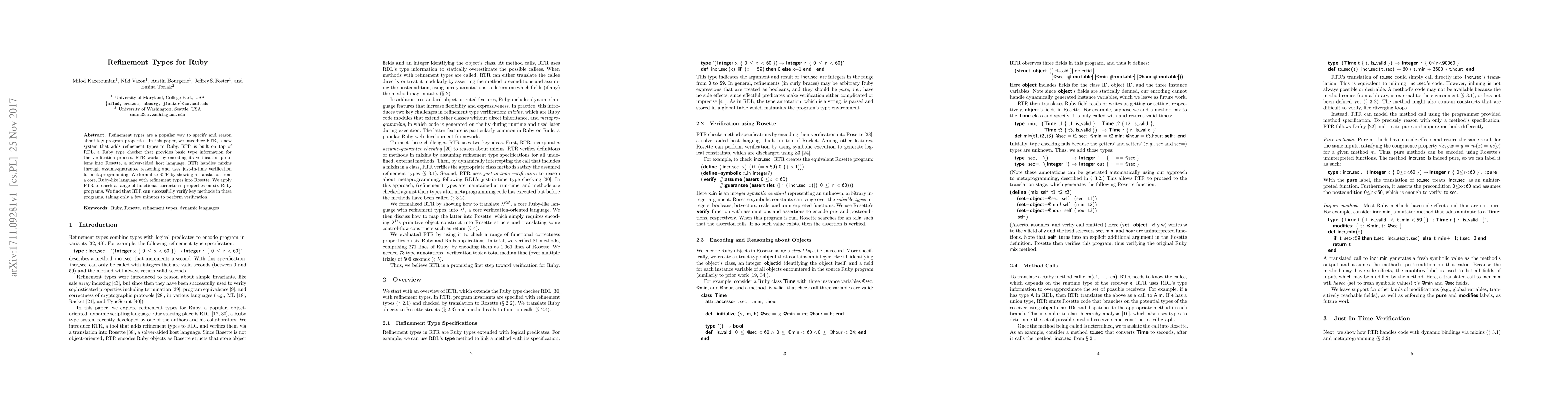 This paper introduces RTR, a system that extends Ruby with refinement types, enabling precise specification and verification of program properties. RTR leverages RDL and uses Rosette for verification, handling mixins via assume-guarantee reasoning and applying just-in-time verification for metaprogramming.