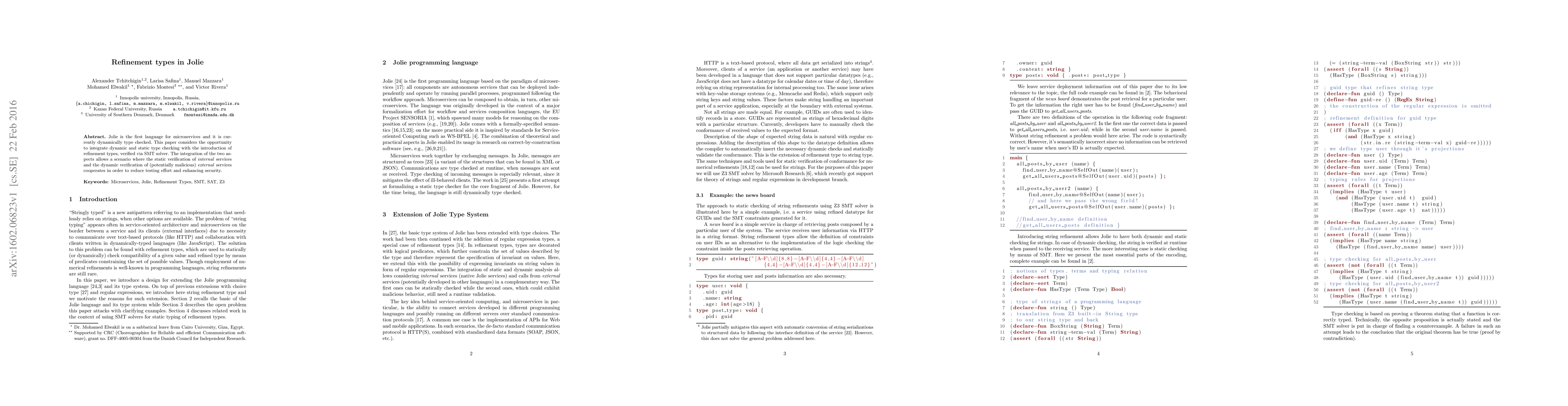 This paper explores integrating dynamic and static type checking in Jolie, a language for microservices, through refinement types verified by an SMT solver, aiming to enhance security and reduce testing effort by combining static verification of internal services with dynamic verification of external services.