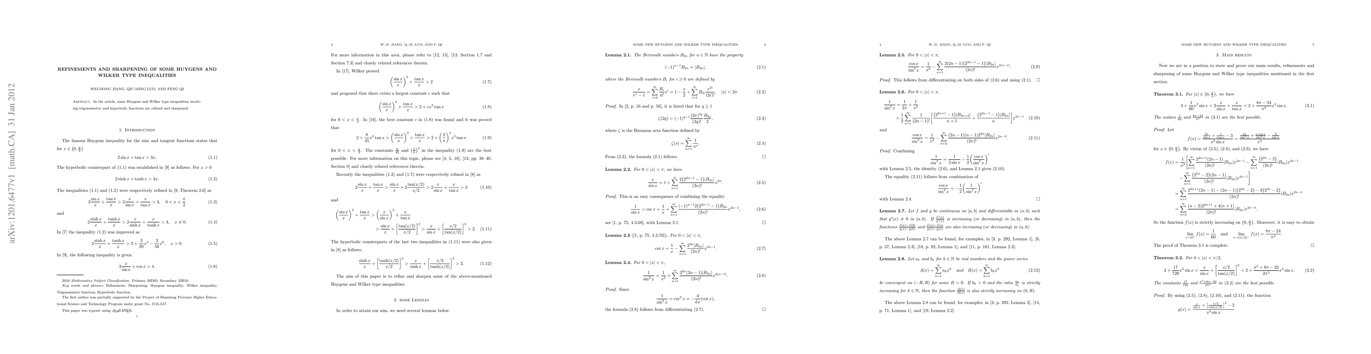 Summary: This paper refines and sharpens Huygens and Wilker type inequalities, providing improved bounds for inequalities involving trigonometric and hyperbolic functions. The results enhance existing mathematical inequalities.