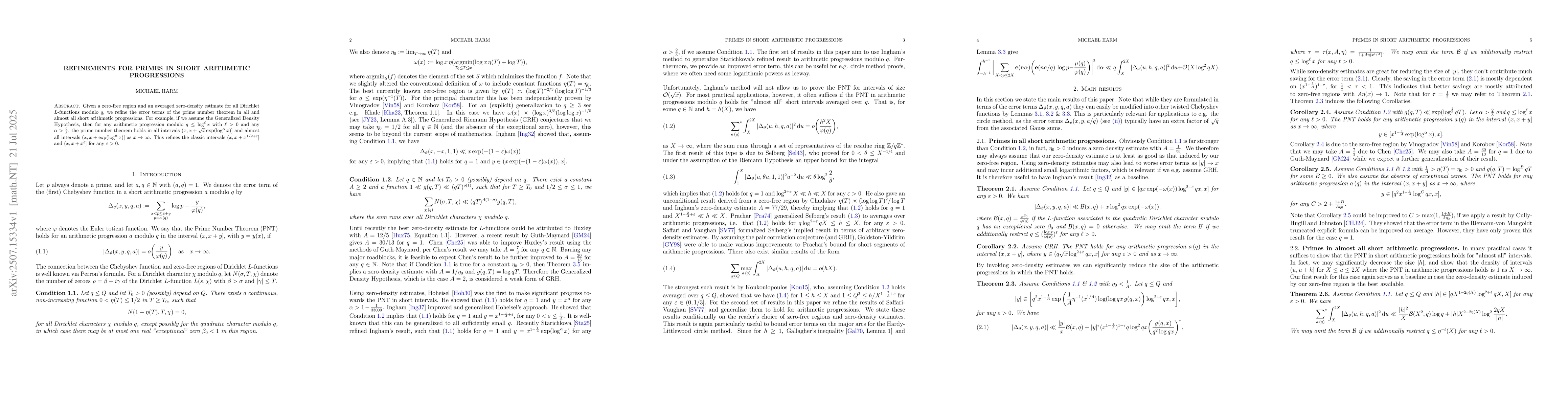 Given a zero-free region and an averaged zero-density estimate for all Dirichlet $L$-functions modulo $q$, we refine the error terms of the prime number theorem in all and almost all short arithmetic progressions. For example, if we assume the Generalized Density Hypothesis, then for any arithmetic progression modulo $q\leq \log^{\ell} x$ with $\ell>0$ and any $\alpha>\frac{2}{3}$, the prime number theorem holds in all intervals $(x,x+\sqrt{x}\exp(\log^\alpha x)]$ and almost all intervals $(x,x+\exp(\log^\alpha x)]$ as $x\rightarrow\infty$. This refines the classic intervals $(x,x+x^{1/2+\varepsilon}]$ and $(x,x+x^\varepsilon]$ for any $\varepsilon>0$.