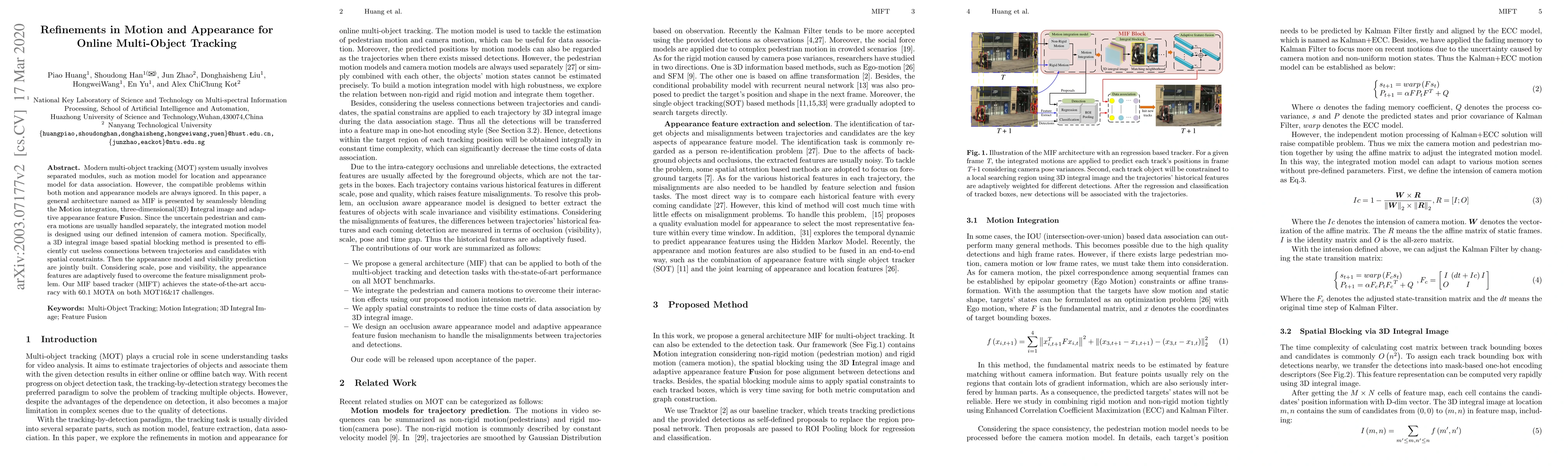 Modern multi-object tracking (MOT) system usually involves separated modules, such as motion model for location and appearance model for data association. However, the compatible problems within both motion and appearance models are always ignored. In this paper, a general architecture named as MIF is presented by seamlessly blending the Motion integration, three-dimensional(3D) Integral image and adaptive appearance feature Fusion. Since the uncertain pedestrian and camera motions are usually handled separately, the integrated motion model is designed using our defined intension of camera motion. Specifically, a 3D integral image based spatial blocking method is presented to efficiently cut useless connections between trajectories and candidates with spatial constraints. Then the appearance model and visibility prediction are jointly built. Considering scale, pose and visibility, the appearance features are adaptively fused to overcome the feature misalignment problem. Our MIF based tracker (MIFT) achieves the state-of-the-art accuracy with 60.1 MOTA on both MOT16&17 challenges.