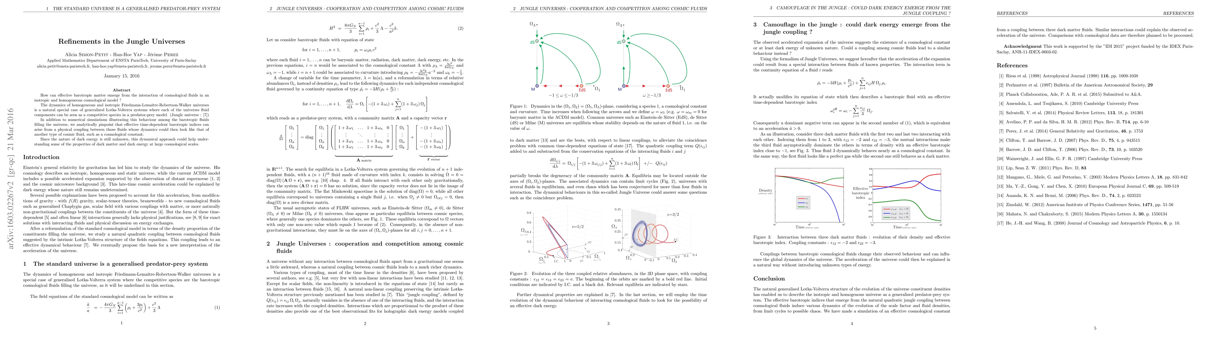How can effective barotropic matter emerge from the interaction of cosmological fluids in an isotropic and homogeneous cosmological model ? The dynamics of homogeneous and isotropic Friedmann-Lema\^itre-Robertson-Walker universes is a natural special case of generalized Lotka-Volterra systems where each of the universe's fluid components can be seen as a competitive species in a predator-prey model. (Jungle universe : arXiv:1306.1037) In addition to numerical simulations illustrating this behaviour among the barotropic fluids filling the universe, we analytically pinpoint that effective time-dependent barotropic indices can arise from a physical coupling between those fluids whose dynamics could then look like that of another type of cosmic fluid, such as a cosmological constant. Since the nature of dark energy is still unknown, this dynamical approach could help understanding some of the properties of dark matter and dark energy at large cosmological scales.