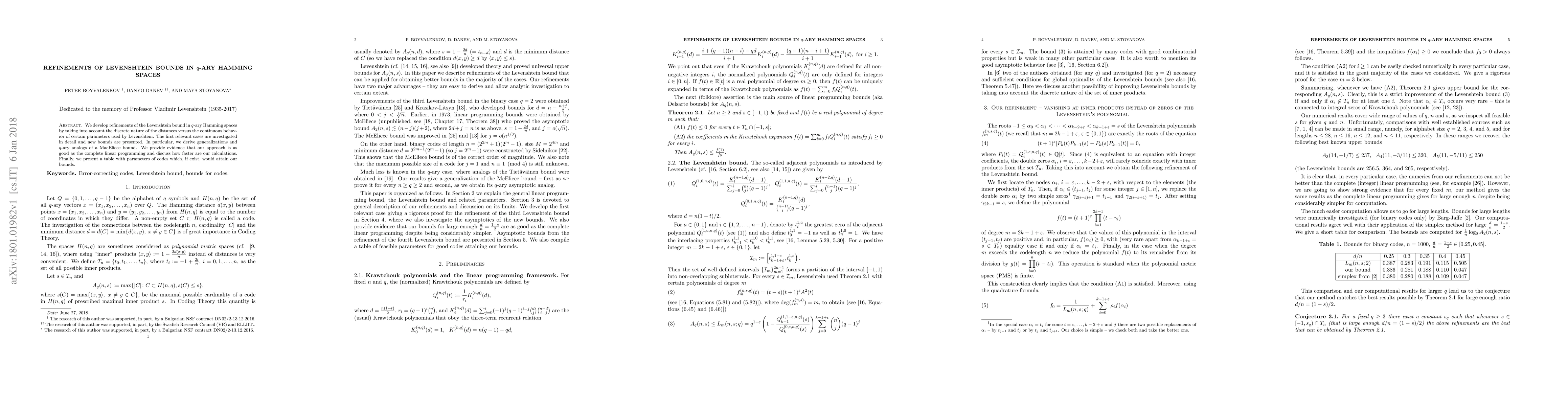 We develop refinements of the Levenshtein bound in $q$-ary Hamming spaces by taking into account the discrete nature of the distances versus the continuous behavior of certain parameters used by Levenshtein. The first relevant cases are investigated in detail and new bounds are presented. In particular, we derive generalizations and $q$-ary analogs of a MacEliece bound. We provide evidence that our approach is as good as the complete linear programming and discuss how faster are our calculations. Finally, we present a table with parameters of codes which, if exist, would attain our bounds.