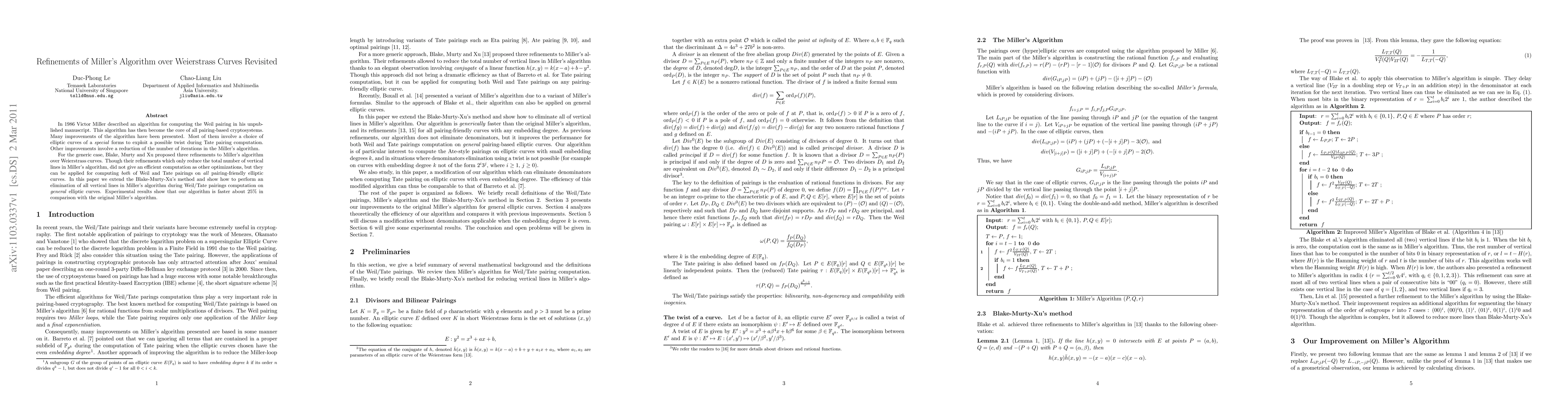 This paper extends Blake, Murty, and Xu's refinements of Miller's algorithm for computing Weil and Tate pairings on Weierstrass curves, achieving the elimination of all vertical lines and demonstrating a 25% improvement in computational speed over the original Miller's algorithm.