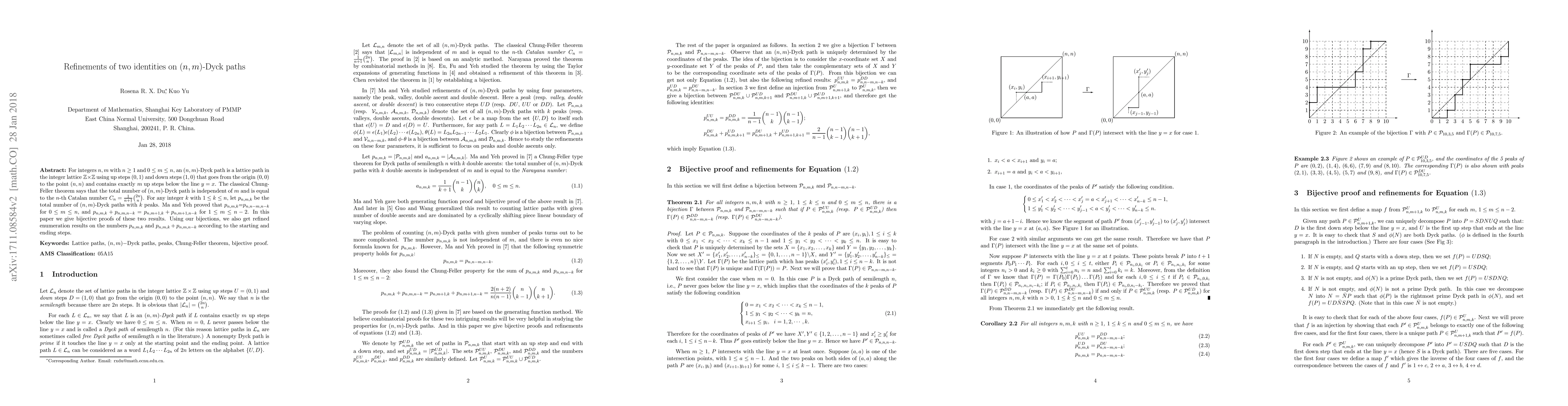 This paper provides bijective proofs for two identities concerning $(n,m)$-Dyck paths, which are lattice paths from $(0,0)$ to $(n,n)$ with specific step constraints. It refines enumeration results for these paths based on the number of peaks and the starting and ending steps.