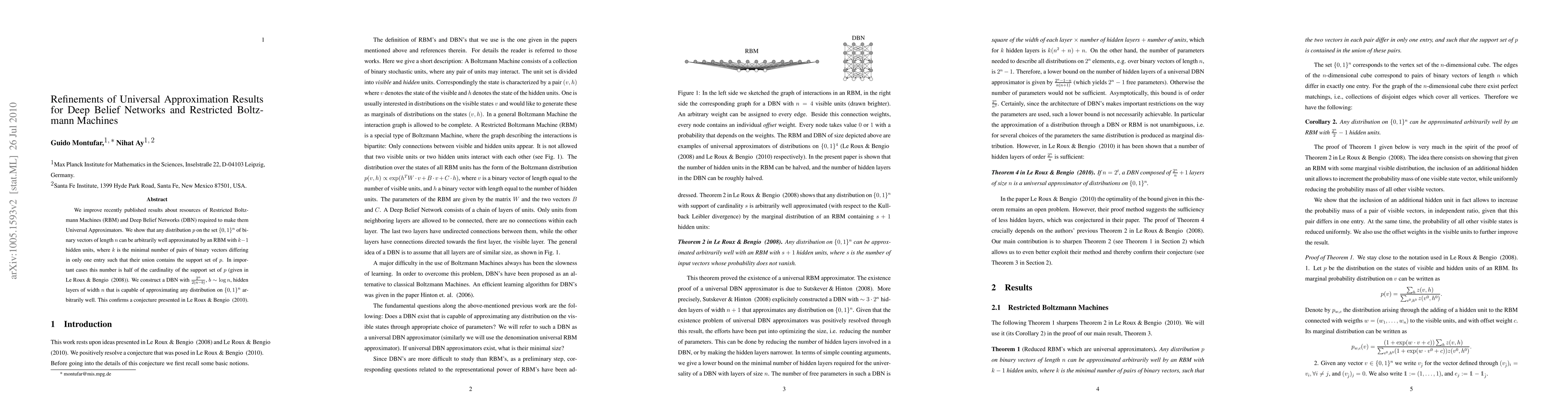 This paper refines universal approximation results for Restricted Boltzmann Machines (RBM) and Deep Belief Networks (DBN), demonstrating that an RBM with k-1 hidden units can approximate any binary distribution, where k is related to the cardinality of the distribution's support set. It also constructs a DBN that approximates any distribution on binary vectors with a specified number of layers, confirming a 2010 conjecture.