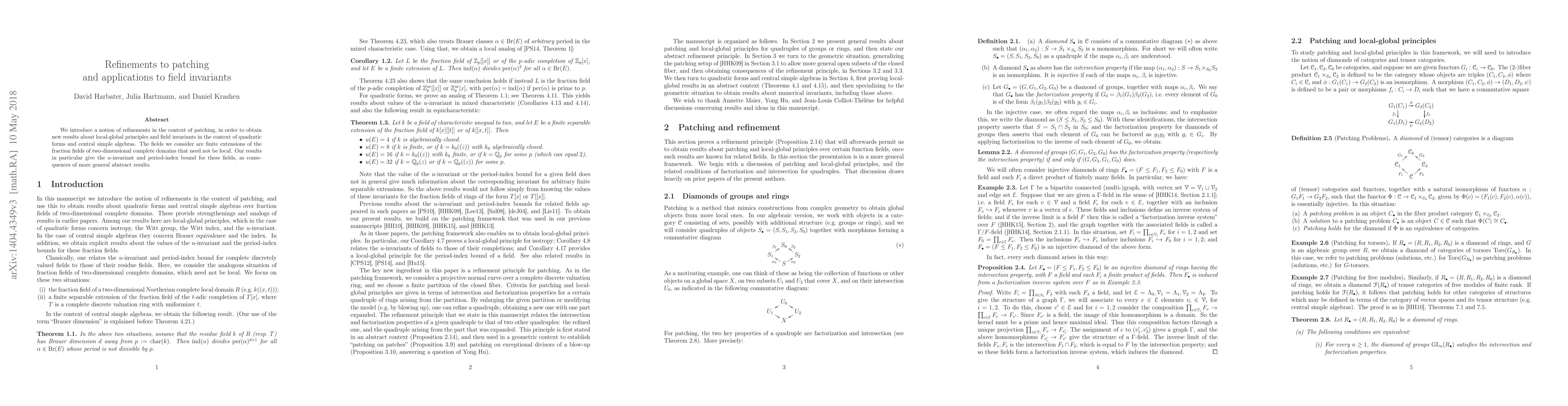 We introduce a notion of refinements in the context of patching, in order to obtain new results about local-global principles and field invariants in the context of quadratic forms and central simple algebras. The fields we consider are finite extensions of the fraction fields of two-dimensional complete domains that need not be local. Our results in particular give the u-invariant and period-index bound for these fields, as consequences of more general abstract results.