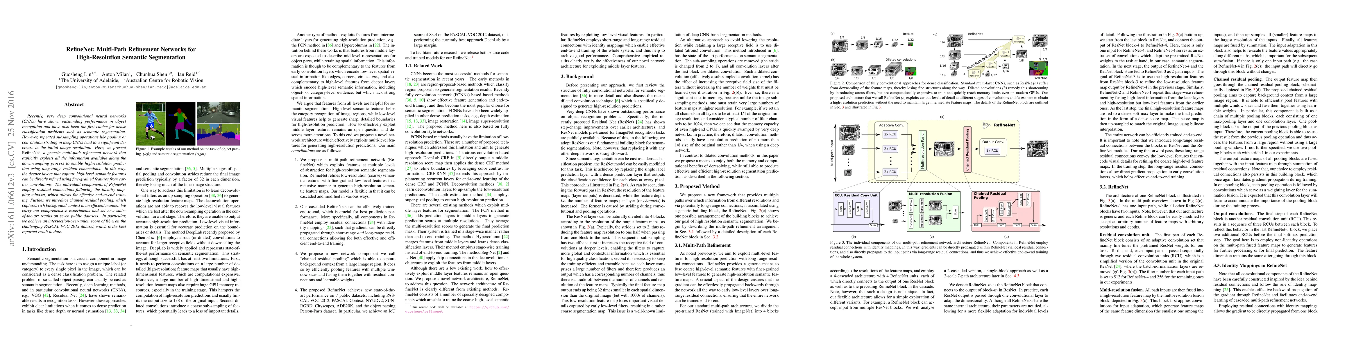 Recently, very deep convolutional neural networks (CNNs) have shown outstanding performance in object recognition and have also been the first choice for dense classification problems such as semantic segmentation. However, repeated subsampling operations like pooling or convolution striding in deep CNNs lead to a significant decrease in the initial image resolution. Here, we present RefineNet, a generic multi-path refinement network that explicitly exploits all the information available along the down-sampling process to enable high-resolution prediction using long-range residual connections. In this way, the deeper layers that capture high-level semantic features can be directly refined using fine-grained features from earlier convolutions. The individual components of RefineNet employ residual connections following the identity mapping mindset, which allows for effective end-to-end training. Further, we introduce chained residual pooling, which captures rich background context in an efficient manner. We carry out comprehensive experiments and set new state-of-the-art results on seven public datasets. In particular, we achieve an intersection-over-union score of 83.4 on the challenging PASCAL VOC 2012 dataset, which is the best reported result to date.