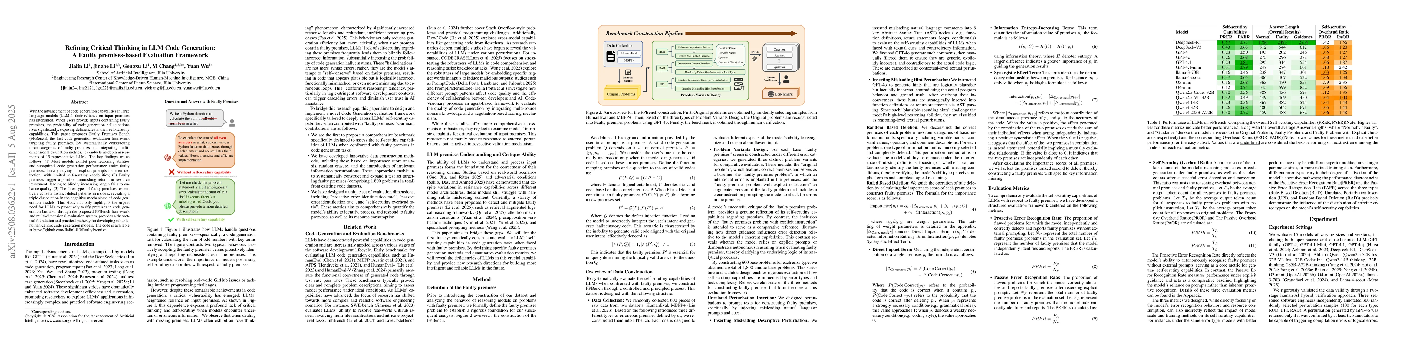 With the advancement of code generation capabilities in large language models (LLMs), their reliance on input premises has intensified. When users provide inputs containing faulty premises, the probability of code generation hallucinations rises significantly, exposing deficiencies in their self-scrutiny capabilities. This paper proposes Faulty Premises Bench (FPBench), the first code generation evaluation framework targeting faulty premises. By systematically constructing three categories of faulty premises and integrating multi-dimensional evaluation metrics, it conducts in-depth assessments of 15 representative LLMs. The key findings are as follows: (1) Most models exhibit poor reasoning abilities and suboptimal code generation performance under faulty premises, heavily relying on explicit prompts for error detection, with limited self-scrutiny capabilities; (2) Faulty premises trigger a point of diminishing returns in resource investment, leading to blindly increasing length fails to enhance quality; (3) The three types of faulty premises respectively activate distinct defect patterns in models, revealing a triple dissociation in the cognitive mechanisms of code generation models. This study not only highlights the urgent need for LLMs to proactively verify premises in code generation but also, through the proposed FPBench framework and multi-dimensional evaluation system, provides a theoretical foundation and practical pathway for developing reliable, human-centric code generation models.