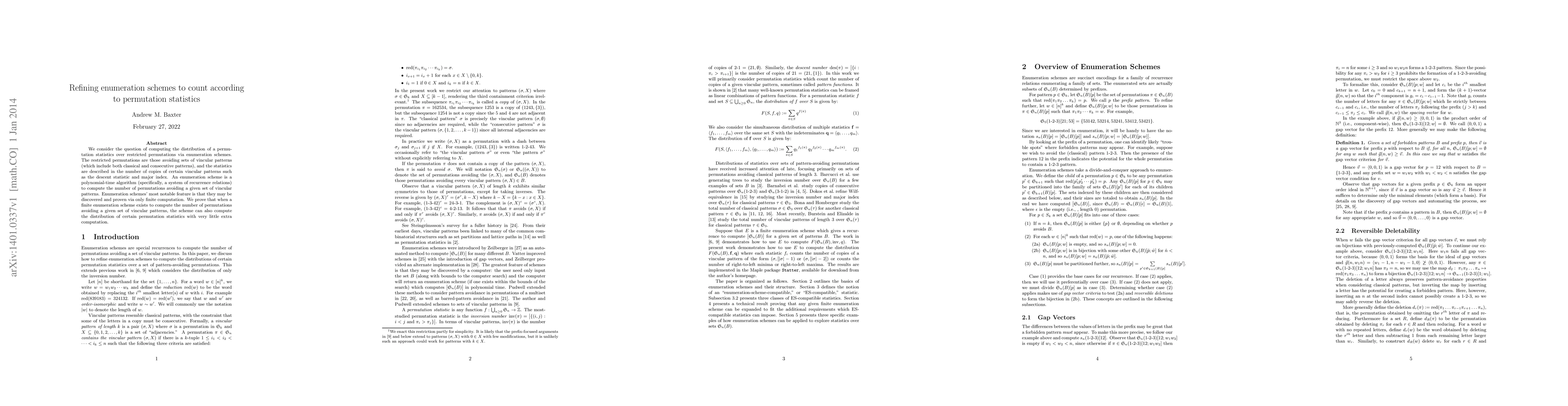 We consider the question of computing the distribution of a permutation statistics over restricted permutations via enumeration schemes. The restricted permutations are those avoiding sets of vincular patterns (which include both classical and consecutive patterns), and the statistics are described in the number of copies of certain vincular patterns such as the descent statistic and major index. An enumeration scheme is a polynomial-time algorithm (specifically, a system of recurrence relations) to compute the number of permutations avoiding a given set of vincular patterns. Enumeration schemes' most notable feature is that they may be discovered and proven via only finite computation. We prove that when a finite enumeration scheme exists to compute the number of permutations avoiding a given set of vincular patterns, the scheme can also compute the distribution of certain permutation statistics with very little extra computation.