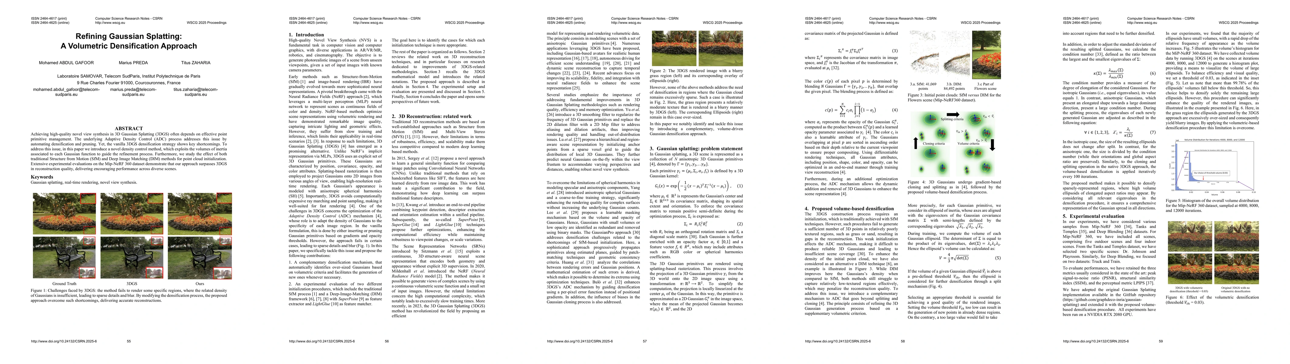 Achieving high-quality novel view synthesis in 3D Gaussian Splatting (3DGS) often depends on effective point primitive management. The underlying Adaptive Density Control (ADC) process addresses this issue by automating densification and pruning. Yet, the vanilla 3DGS densification strategy shows key shortcomings. To address this issue, in this paper we introduce a novel density control method, which exploits the volumes of inertia associated to each Gaussian function to guide the refinement process. Furthermore, we study the effect of both traditional Structure from Motion (SfM) and Deep Image Matching (DIM) methods for point cloud initialization. Extensive experimental evaluations on the Mip-NeRF 360 dataset demonstrate that our approach surpasses 3DGS in reconstruction quality, delivering encouraging performance across diverse scenes.