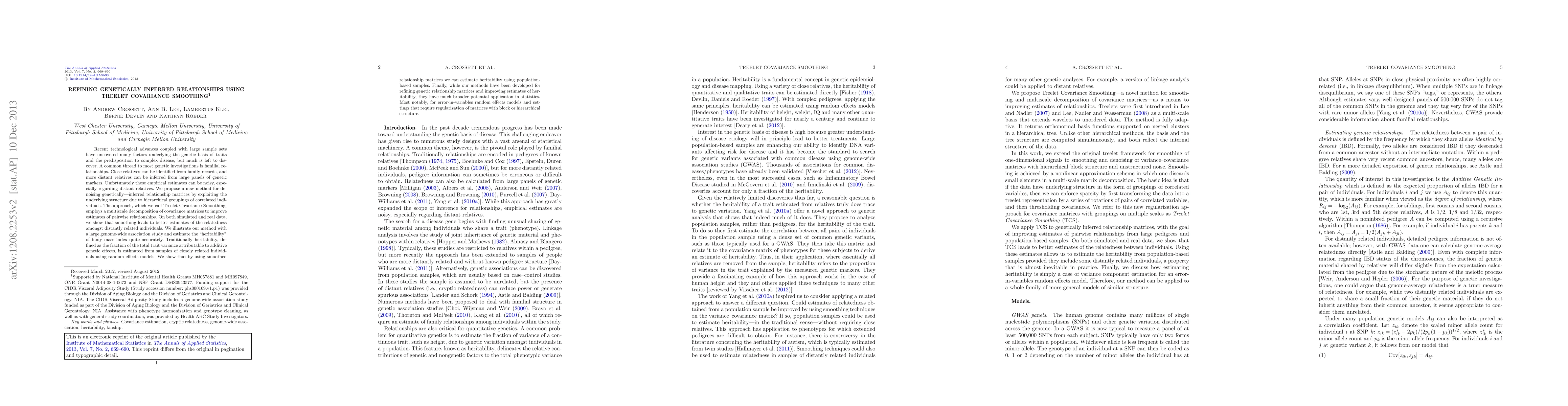 This research introduces Treelet Covariance Smoothing, a method for refining genetically inferred relationship matrices. By employing a multiscale decomposition of covariance matrices, it enhances estimates of pairwise relationships, especially for distant relatives. The method improves heritability estimation using population-based samples and has broader applications in statistics, including error-in-variables random effects models and hierarchical matrix structures.