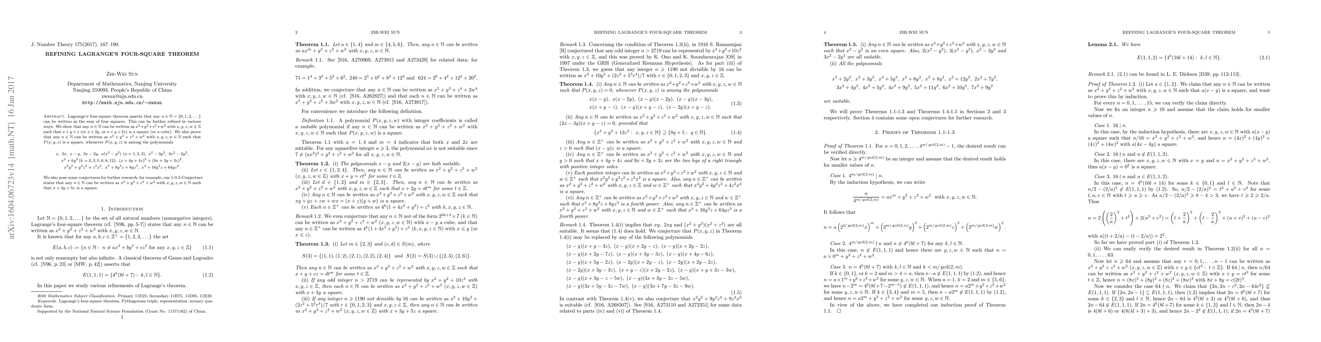 This paper refines Lagrange's four-square theorem by demonstrating that any natural number can be expressed as the sum of four squares under specific constraints, such as certain linear combinations of the squares being perfect squares or cubes. The authors also propose several conjectures, including the 1-3-5-Conjecture.