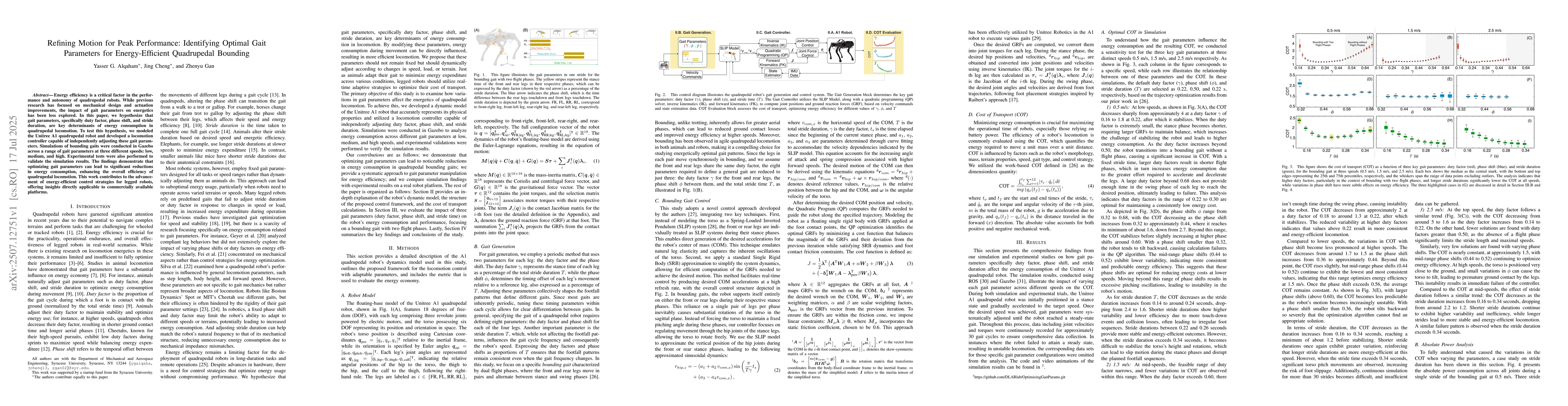 Energy efficiency is a critical factor in the performance and autonomy of quadrupedal robots. While previous research has focused on mechanical design and actuation improvements, the impact of gait parameters on energetics has been less explored. In this paper, we hypothesize that gait parameters, specifically duty factor, phase shift, and stride duration, are key determinants of energy consumption in quadrupedal locomotion. To test this hypothesis, we modeled the Unitree A1 quadrupedal robot and developed a locomotion controller capable of independently adjusting these gait parameters. Simulations of bounding gaits were conducted in Gazebo across a range of gait parameters at three different speeds: low, medium, and high. Experimental tests were also performed to validate the simulation results. The findings demonstrate that optimizing gait parameters can lead to significant reductions in energy consumption, enhancing the overall efficiency of quadrupedal locomotion. This work contributes to the advancement of energy-efficient control strategies for legged robots, offering insights directly applicable to commercially available platforms.