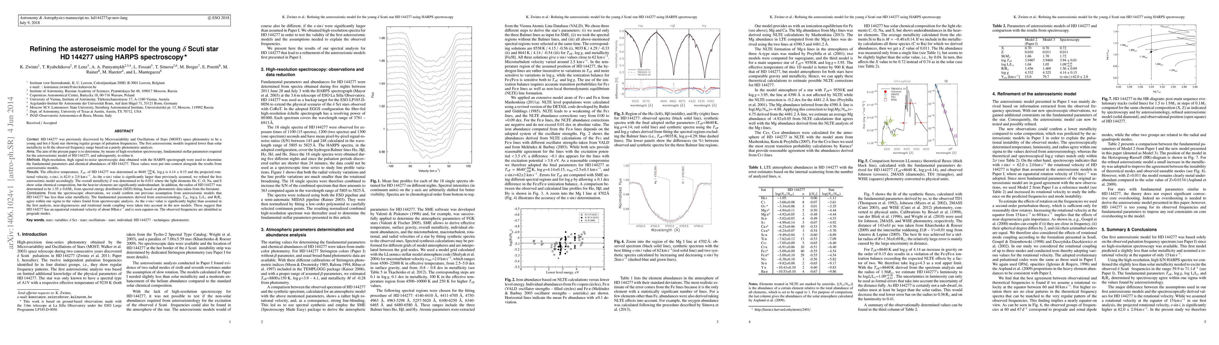 HD 144277 was previously discovered by MOST space photometry to be a young and hot delta Scuti star showing regular groups of pulsation frequencies. The first asteroseismic models required lower than solar metallicity to fit the observed frequency range based on a purely photometric analysis. High-resolution, high S/N spectroscopic data obtained with the HARPS spectrograph were used to determine the fundamental parameters and chemical abundances of HD 144277. These values were put into context alongside the results from asteroseismic models. The effective temperature, Teff, of HD 144277 was determined as 8640(+300)(-100) K, log g is 4.14 +/- 0.15 and the projected rotational velocity, vsini, is 62.0 +/- 2.0 km/s. As the vsini value is significantly larger than previously assumed, we refined the first asteroseimic model accordingly. The overall metallicity Z was determined to be 0.011 where the light elements He, C, O, Na, and S show solar chemical composition, but the heavier elements are significantly underabundant. In addition, the radius of HD 144277 was determined to be 1.55 +/- 0.65 Rsun from spectral energy distribution fitting, based on photometric data taken from the literature. From the spectroscopic observations, we could confirm our previous assumption from asteroseismic models that HD 144277 has less than solar metallicity. The fundamental parameters derived from asteroseismology, Teff, log g, L/Lsun and R\Rsun, agree within one sigma to the values found from spectroscopic analysis. As the vsini value is significantly higher than assumed in the first analysis, near-degeneracies and rotational mode coupling were taken into account in the new models. These suggest that HD 144277 has an equatorial rotational velocity of about 80 km/s and is seen equator-on. The observed frequencies are identified as prograde modes.