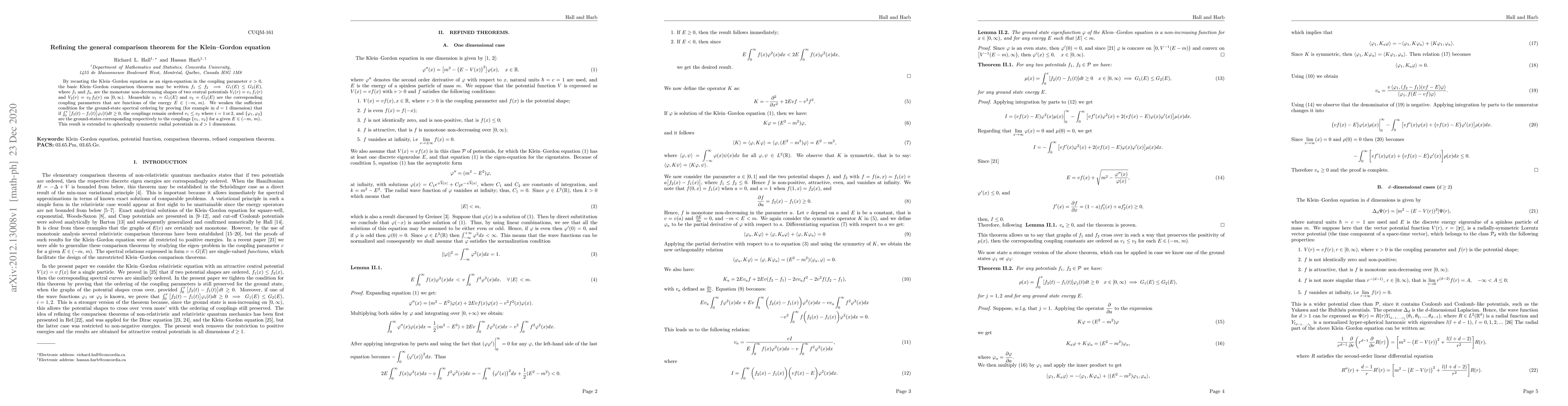 This paper refines the general comparison theorem for the Klein-Gordon equation by recasting it as an eigen-equation in the coupling parameter, showing that monotone non-decreasing potential shapes maintain ordered coupling parameters, and extends this result to higher dimensions for spherically symmetric radial potentials.