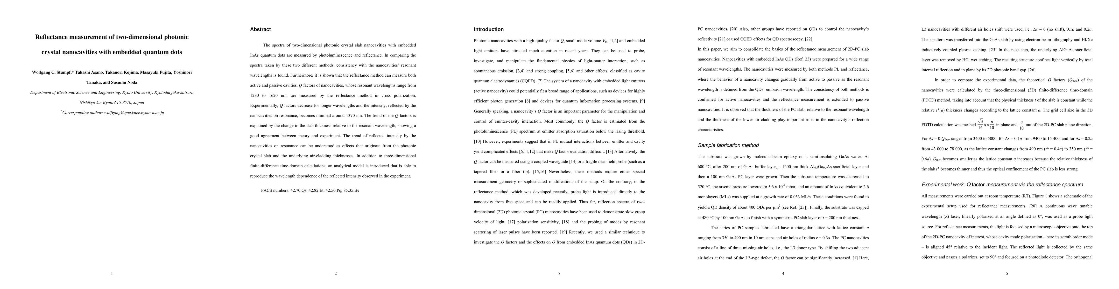 The paper presents an analytical model for calculating nanocavity reflectance, complementing 3D finite-difference time-domain simulations, and demonstrates the reflectance method's effectiveness in measuring Q-factors of two-dimensional photonic crystal slab nanocavities with embedded quantum dots.