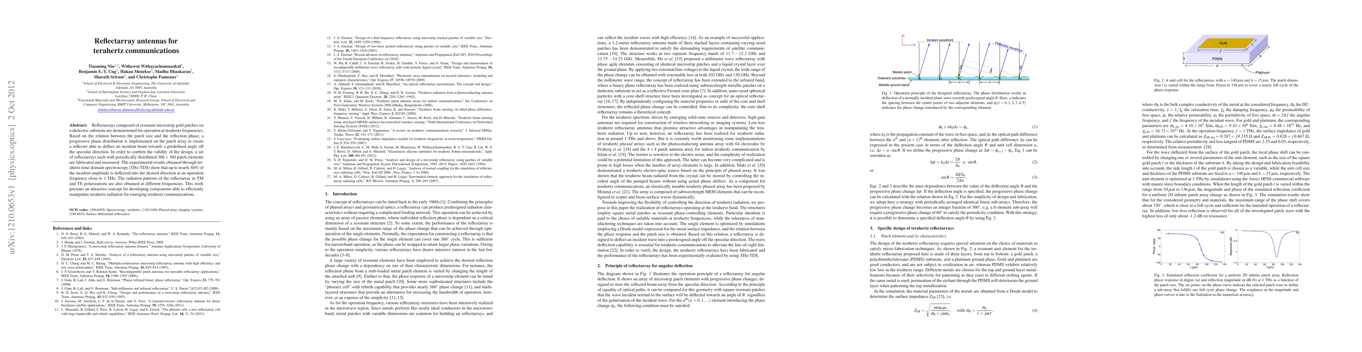 This paper demonstrates reflectarray antennas using resonant microstrip gold patches for terahertz frequency communication, achieving nearly 80% deflection efficiency at 1 THz. Experimental results confirm the design's effectiveness in manipulating terahertz radiation for future communication technologies.