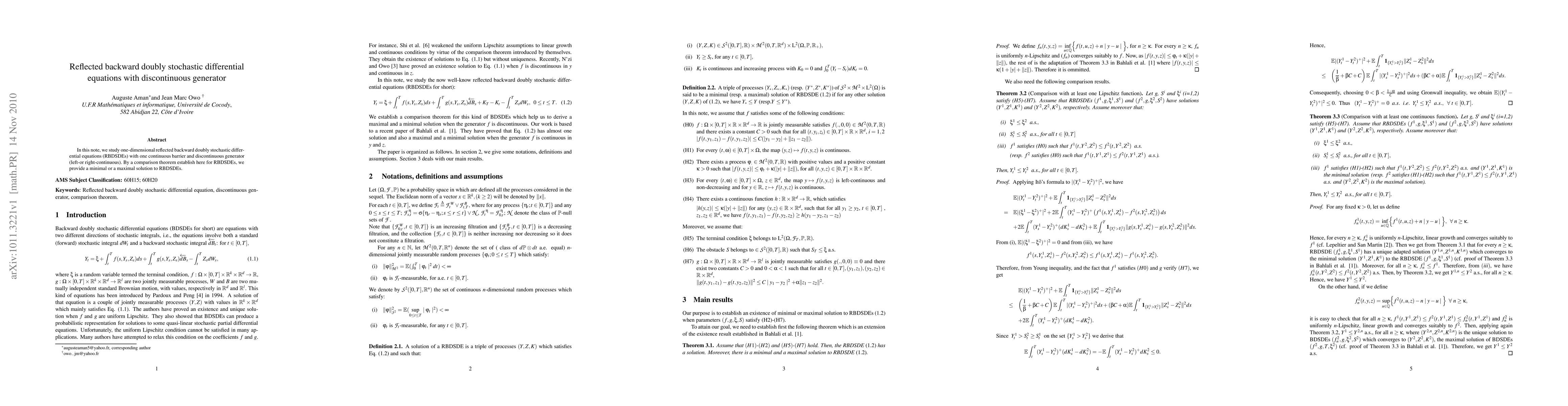 Summary: This paper investigates one-dimensional reflected backward doubly stochastic differential equations (RBDSDEs) with a continuous barrier and a discontinuous generator. The study establishes a comparison theorem to determine minimal or maximal solutions for RBDSDEs.