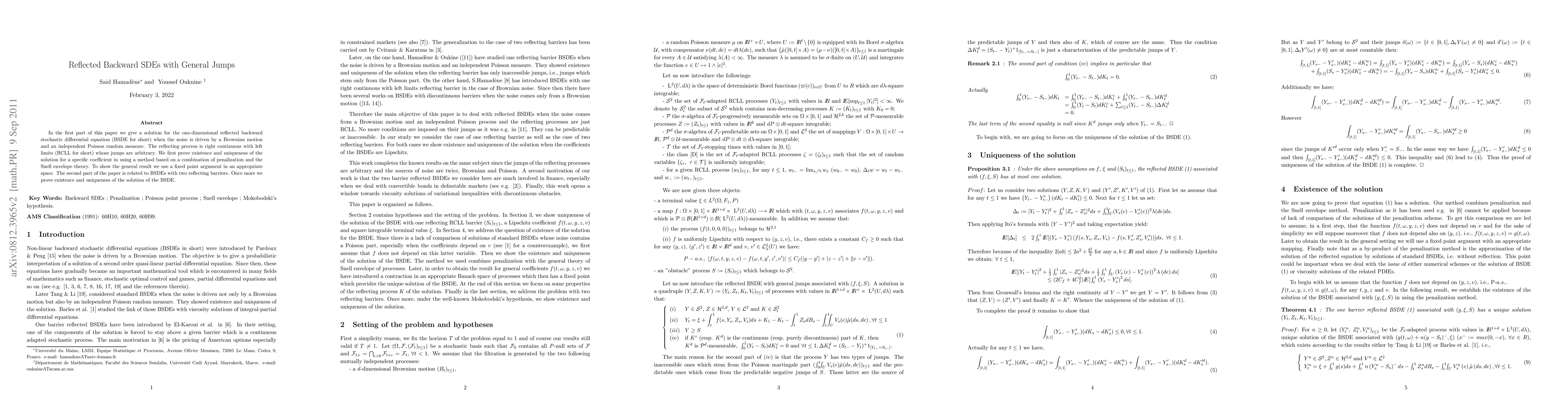 This paper provides a solution for one-dimensional reflected backward stochastic differential equations (BSDEs) driven by a Brownian motion and a Poisson process, proving existence and uniqueness using a combination of penalization and Snell envelope theory. The second part extends the results to BSDEs with two reflecting barriers, again proving existence and uniqueness.