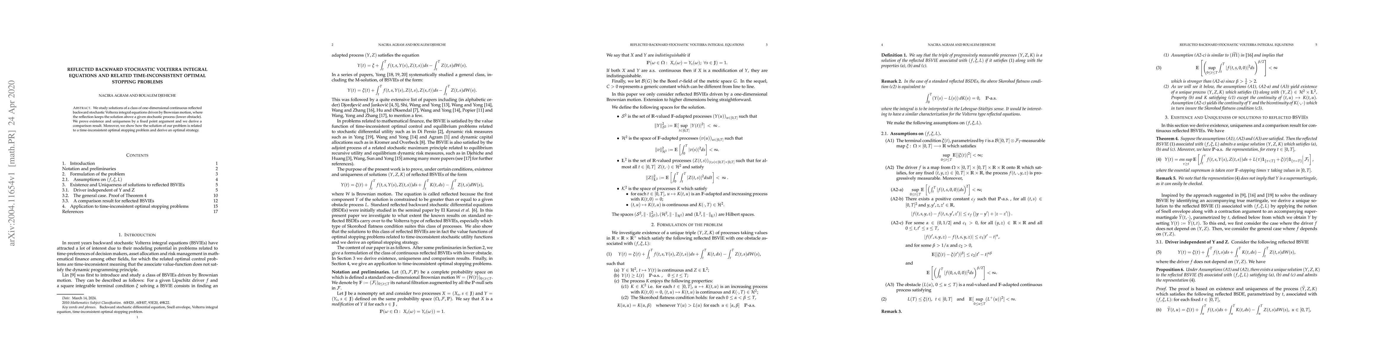This paper investigates solutions to one-dimensional reflected backward stochastic Volterra integral equations driven by Brownian motion, proving existence, uniqueness, and a comparison result. It also connects these solutions to time-inconsistent optimal stopping problems and derives an optimal strategy.