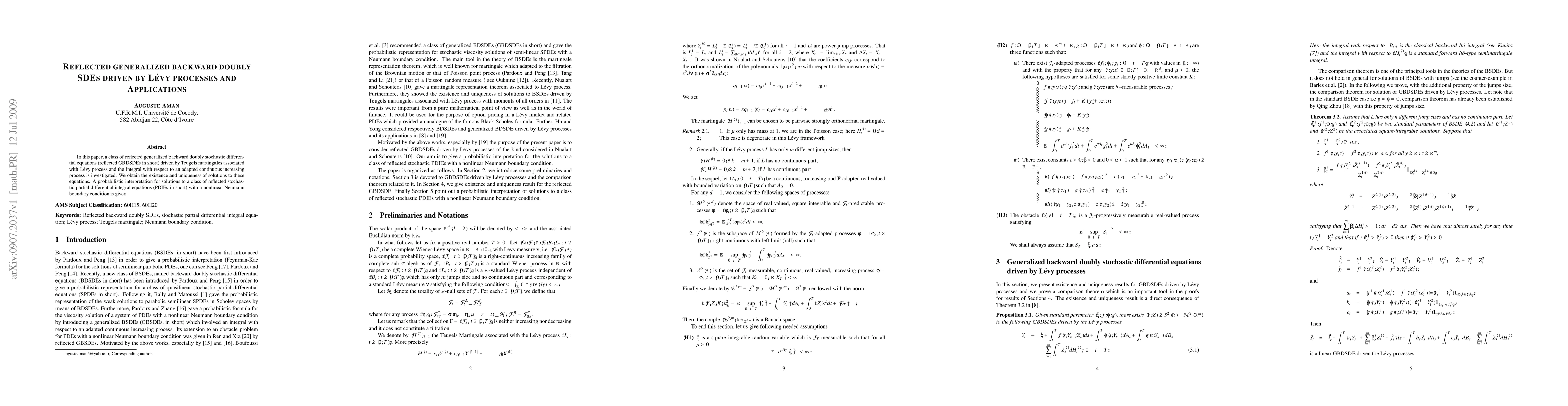 In this paper, a class of reflected generalized backward doubly stochastic differential equations (reflected GBDSDEs in short) driven by Teugels martingales associated with L\'{e}vy process and the integral with respect to an adapted continuous increasing process is investigated. We obtain the existence and uniqueness of solutions to these equations. A probabilistic interpretation for solutions to a class of reflected stochastic partial differential integral equations (PDIEs in short) with a nonlinear Neumann boundary condition is given.