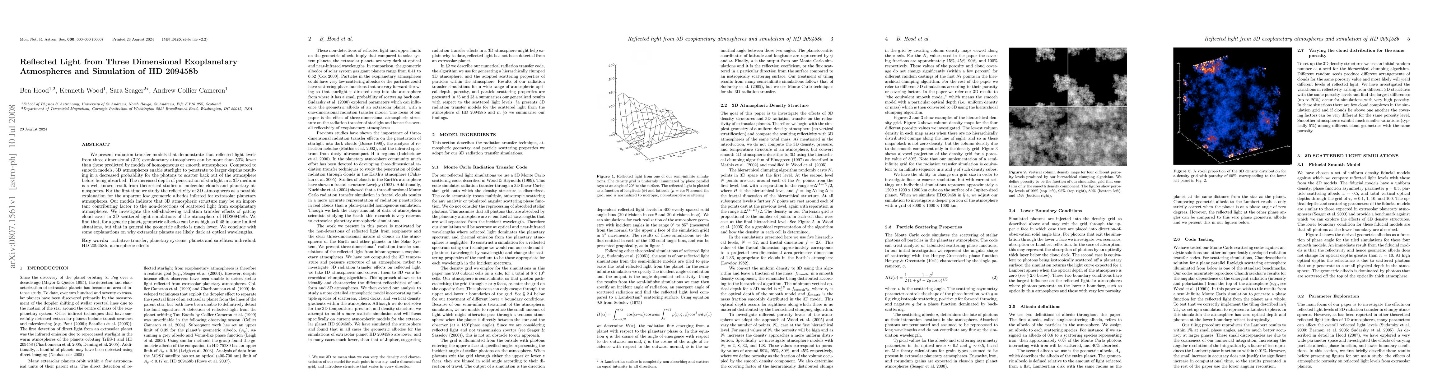 This paper presents 3D radiation transfer models showing that reflected light from exoplanetary atmospheres can be significantly lower than predicted by 2D models due to increased starlight penetration. The study finds that 3D atmospheric structures, including patchy cloud cover, contribute to the low geometric albedos observed, potentially explaining the non-detection of scattered light from many exoplanets.