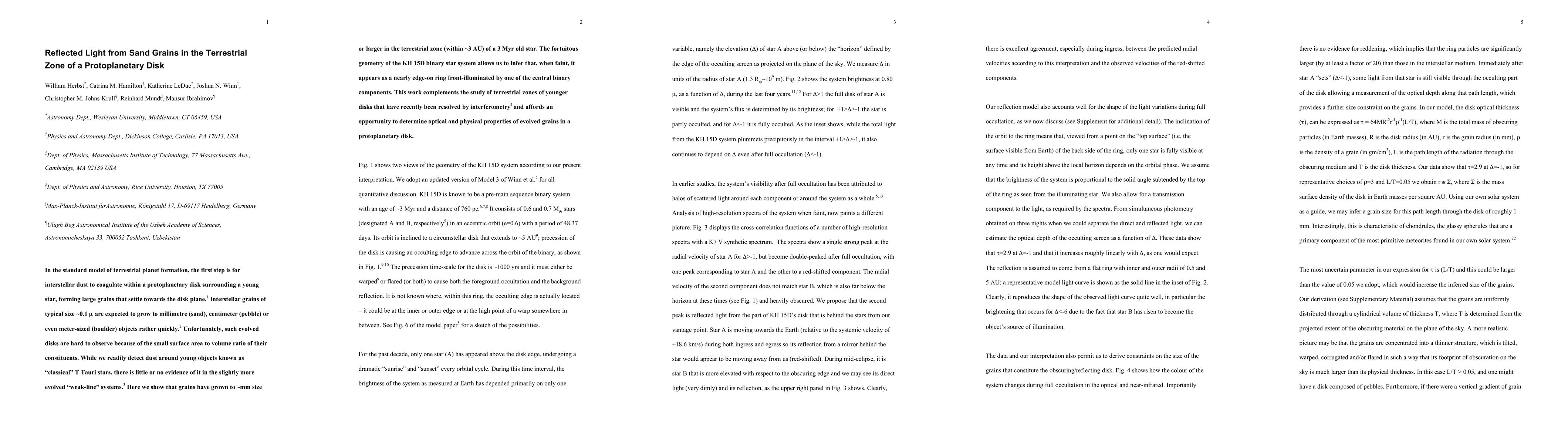 We show that grains have grown to ~mm size (sand sized) or larger in the terrestrial zone (within ~3 AU) of the protoplanetary disk surrounding the 3 Myr old binary star KH 15D. We also argue that the reflected light in the system reaches us by back scattering off the far side of the same ring whose near side causes the obscuration.