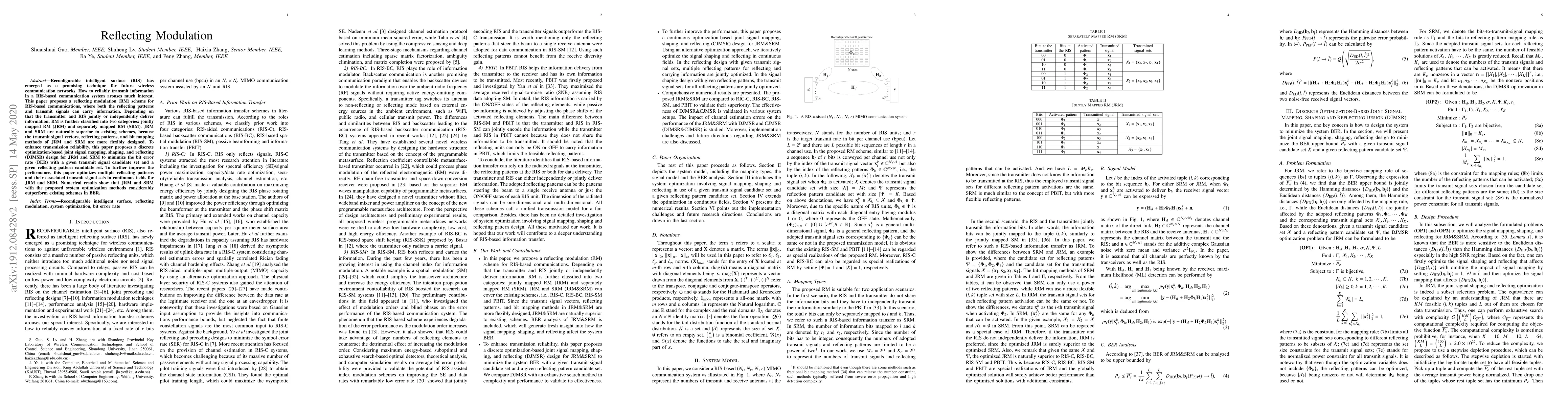 Reconfigurable intelligent surface (RIS) has emerged as a promising technique for future wireless communication networks. How to reliably transmit information in a RIS-based communication system arouses much interest. This paper proposes a reflecting modulation (RM) scheme for RIS-based communications, where both the reflecting patterns and transmit signals can carry information. Depending on that the transmitter and RIS jointly or independently deliver information, RM is further classified into two categories: jointly mapped RM (JRM) and separately mapped RM (SRM). JRM and SRM are naturally superior to existing schemes, because the transmit signal vectors, reflecting patterns, and bit mapping methods of JRM and SRM are more flexibly designed. To enhance transmission reliability, this paper proposes a discrete optimization-based joint signal mapping, shaping, and reflecting (DJMSR) design for JRM and SRM to minimize the bit error rate (BER) with a given transmit signal candidate set and a given reflecting pattern candidate set. To further improve the performance, this paper optimizes multiple reflecting patterns and their associated transmit signal sets in continuous fields for JRM and SRM. Numerical results show that JRM and SRM with the proposed system optimization methods considerably outperform existing schemes in BER.