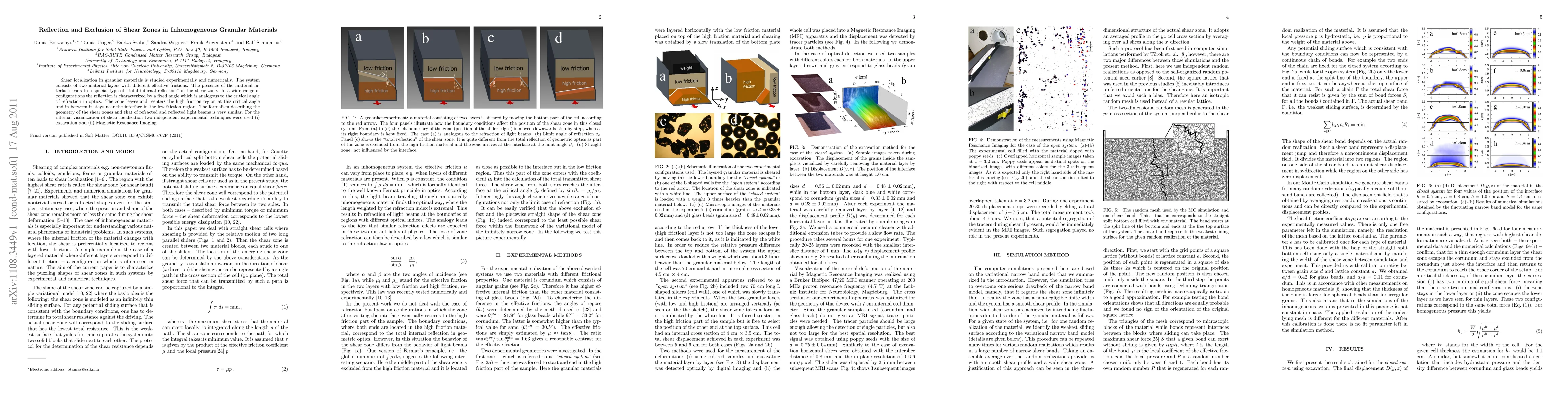 The study investigates shear localization in granular materials with two layers of different effective friction using experimental and numerical methods. Shear zones' behavior is analyzed via 'total internal reflection' at an interface, akin to light refraction in optics.