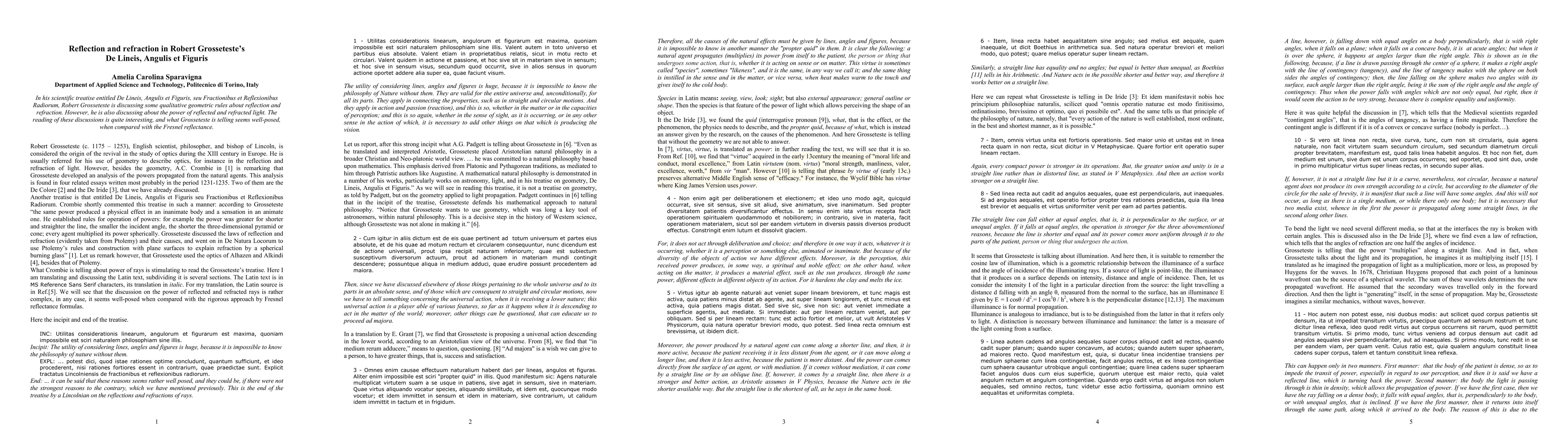 Summary: Robert Grosseteste's treatise De Lineis, Angulis et Figuris discusses qualitative geometric rules of reflection and refraction, and the power of light in these processes, showing a well-posed approach comparable to modern Fresnel reflectance principles.