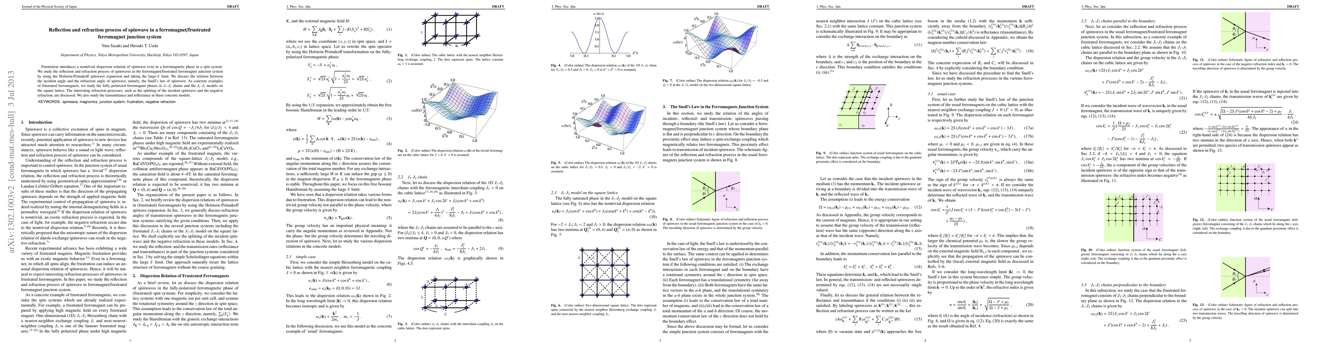 This paper investigates the reflection and refraction of spinwaves at the junction between ferromagnets and frustrated ferromagnets, employing the Holstein-Primakoff expansion and large-S limit. It explores phenomena like spinwave splitting and negative refraction, and examines transmittance and reflectance in J1-J2 chain and square lattice models.
