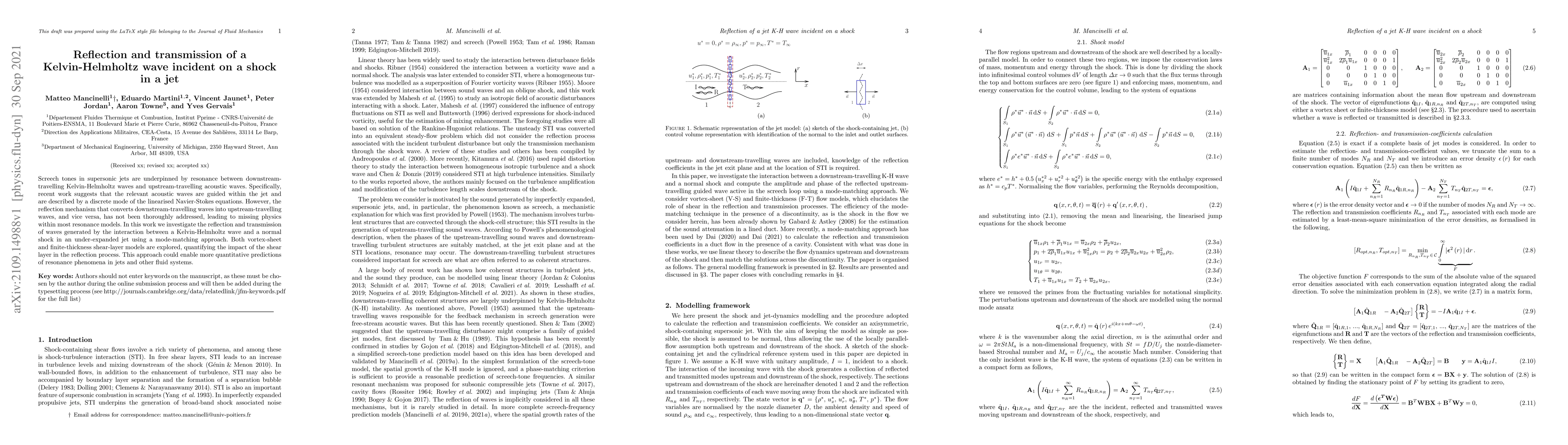 This paper investigates the reflection and transmission of Kelvin-Helmholtz waves interacting with a shock in a jet, using mode-matching to explore vortex-sheet and finite-thickness shear-layer models. The study aims to clarify the wave conversion mechanisms that underpin screech tones, potentially improving resonance models for supersonic jets.