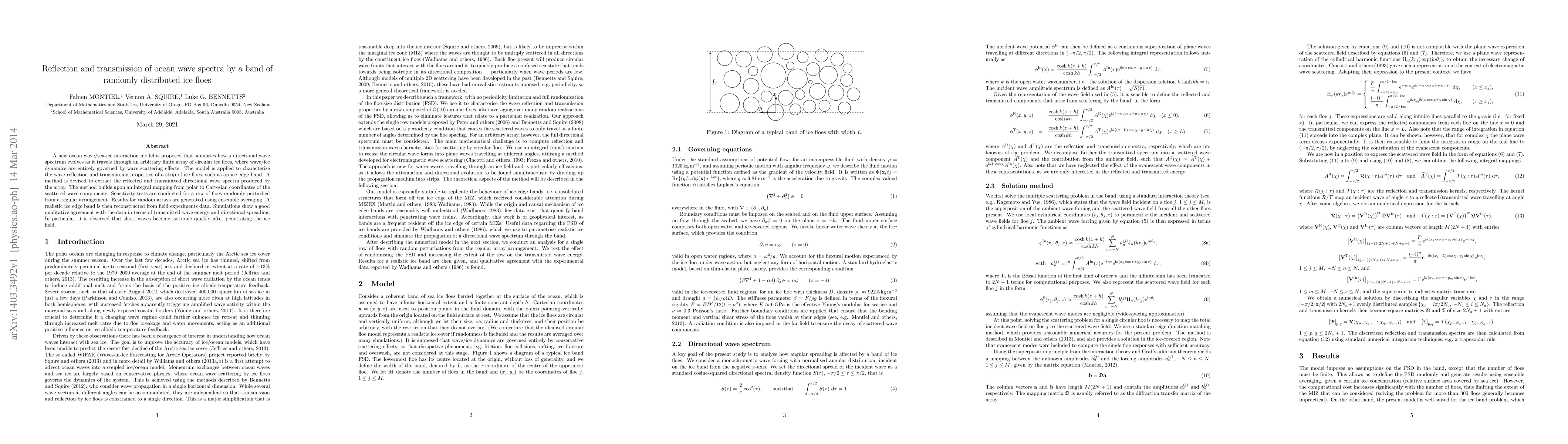 This paper proposes a new model to simulate ocean wave interactions with randomly distributed ice floes, focusing on wave reflection and transmission properties. The model uses wave scattering dynamics and ensemble averaging to analyze wave spectra, showing good agreement with field data and indicating that short waves become isotropic after passing through the ice.