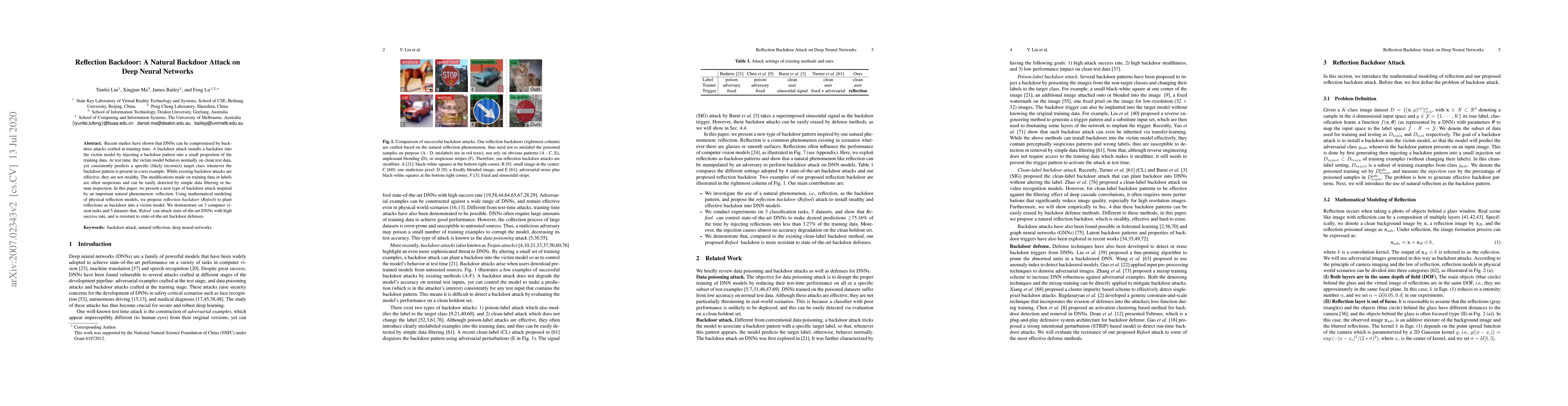 This paper presents a new type of stealthy backdoor attack called Reflection Backdoor (Refool) that uses reflections as a natural trigger to compromise deep neural networks. Unlike previous attacks, Refool is designed to be less detectable, demonstrating high success rates and resistance to current defenses across various computer vision tasks and datasets.