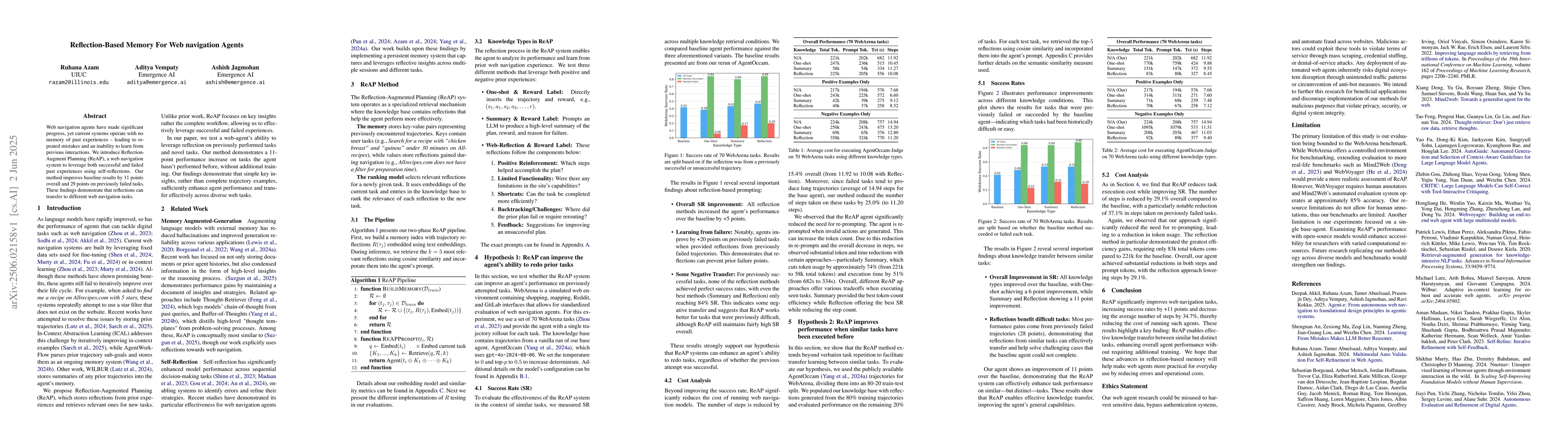 The paper introduces Reflection-Augment Planning (ReAP), a web navigation system that uses self-reflections to leverage past experiences for improving navigation agent performance.