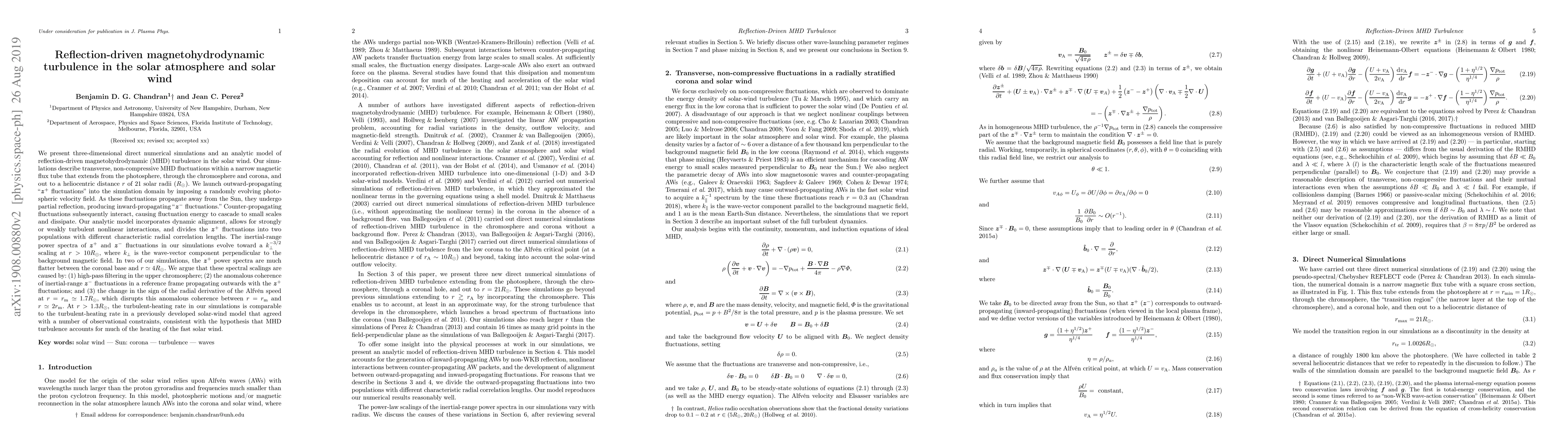 We present 3D numerical simulations and an analytic model of reflection-driven MHD turbulence in the solar wind. Our simulations describe transverse, non-compressive MHD fluctuations within a narrow magnetic flux tube that extends from the photosphere out to a heliocentric distance $r$ of 21 solar radii $(R_s)$. We launch outward-propagating "$z^+$ fluctuations" into the simulation domain by imposing a randomly evolving photospheric velocity field. As these fluctuations propagate away from the Sun, they undergo partial reflection, producing inward-propagating "$z^-$ fluctuations." Counter-propagating fluctuations subsequently interact, causing fluctuation energy to cascade to small scales and dissipate. Our analytic model incorporates alignment, allows for strongly or weakly turbulent nonlinear interactions, and divides the $z^+$ fluctuations into two populations with different characteristic radial correlation lengths. The inertial-range power spectra in our simulations evolve toward a $k_\perp^{-3/2}$ scaling at $r>10 R_s$, where $k_\perp$ is the wave-vector component perpendicular to the background magnetic field. In two of our simulations, the $z^+$ power spectra are much flatter between the coronal base and $r \simeq 4 R_s$. We argue that these spectral scalings are caused by: (1) high-pass filtering in the upper chromosphere; (2) the anomalous coherence of inertial-range $z^-$ fluctuations in a reference frame propagating outwards with the $z^+$ fluctuations; and (3) the change in the sign of the radial derivative of the Alfv\'en speed at $r=r_m \simeq 1.7 R_s$, which disrupts this anomalous coherence between $r=r_m$ and $r\simeq 2r_m$. At $r>1.3 R_s$, the turbulent heating rate in our simulations is comparable to the heating rate in a previously developed solar-wind model that agreed with a number of observational constraints.