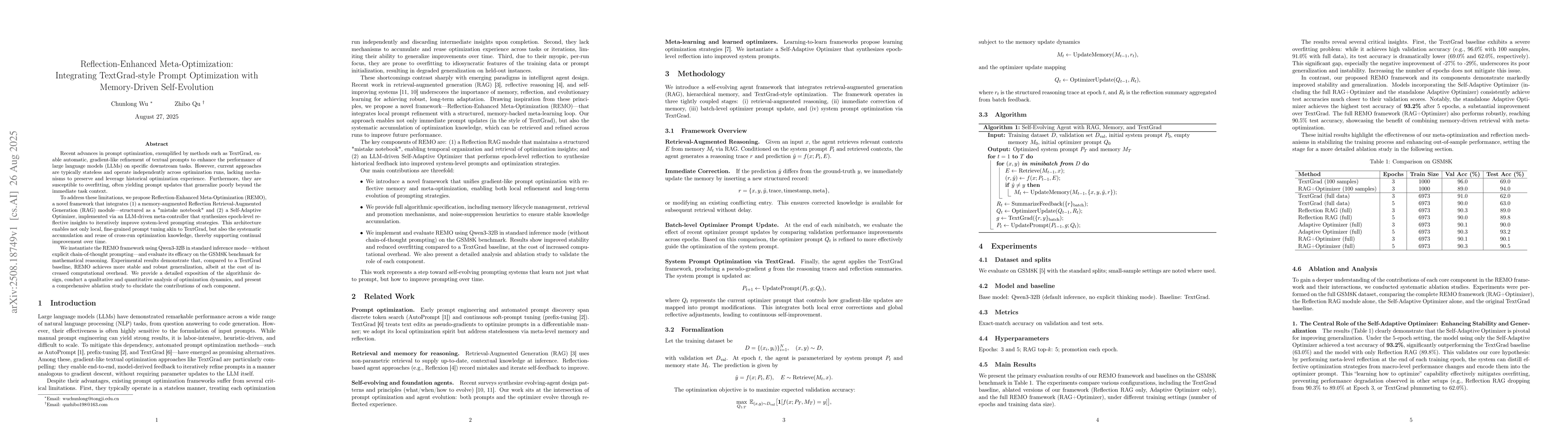 Recent advances in prompt optimization, exemplified by methods such as TextGrad, enable automatic, gradient-like refinement of textual prompts to enhance the performance of large language models (LLMs) on specific downstream tasks. However, current approaches are typically stateless and operate independently across optimization runs, lacking mechanisms to preserve and leverage historical optimization experience. Furthermore, they are susceptible to overfitting, often yielding prompt updates that generalize poorly beyond the immediate task context. To address these limitations, we propose Reflection-Enhanced Meta-Optimization (REMO), a novel framework that integrates (1) a memory-augmented Reflection Retrieval-Augmented Generation (RAG) module - structured as a "mistake notebook" and (2) a Self-Adaptive Optimizer, implemented via an LLM-driven meta-controller that synthesizes epoch-level reflective insights to iteratively improve system-level prompting strategies. This architecture enables not only local, fine-grained prompt tuning akin to TextGrad, but also the systematic accumulation and reuse of cross-run optimization knowledge, thereby supporting continual improvement over time. We instantiate the REMO framework using Qwen3-32B in standard inference mode - without explicit chain-of-thought prompting - and evaluate its efficacy on the GSM8K benchmark for mathematical reasoning. Experimental results demonstrate that, compared to a TextGrad baseline, REMO achieves more stable and robust generalization, albeit at the cost of increased computational overhead. We provide a detailed exposition of the algorithmic design, conduct a qualitative and quantitative analysis of optimization dynamics, and present a comprehensive ablation study to elucidate the contributions of each component.