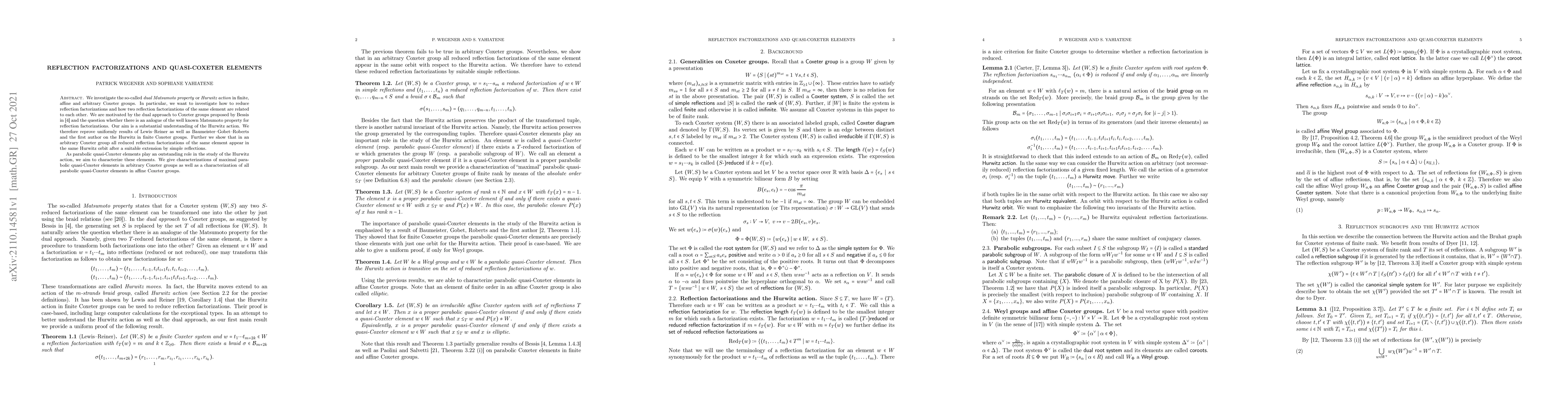 We investigate the so-called dual Matsumoto property or Hurwitz action in finite, affine and arbitrary Coxeter groups. In particular, we want to investigate how to reduce reflection factorizations and how two reflection factorizations of the same element are related to each other. We are motivated by the dual approach to Coxeter groups proposed by Bessis and the question whether there is an anlogue of the well known Matsumoto property for reflection factorizations. Our aim is a substantial understanding of the Hurwitz action. We therefore reprove uniformly results of Lewis and Reiner as well as Baumeister, Gobet, Roberts and the first author on the Hurwitz in finite Coxeter groups. Further we show that in an arbitrary Coxeter group all reduced reflection factorizations of the same element appear in the same Hurwitz orbit after a suitable extension by simple reflections. As parabolic quasi-Coxeter elements play an outstanding role in the study of the Hurwitz action, we aim to characterize these elements. We give characterizations of maximal parabolic quasi-Coxeter elements in arbitrary Coxeter groups as well as a characterization of all parabolic quasi-Coxeter elements in affine Coxeter groups.