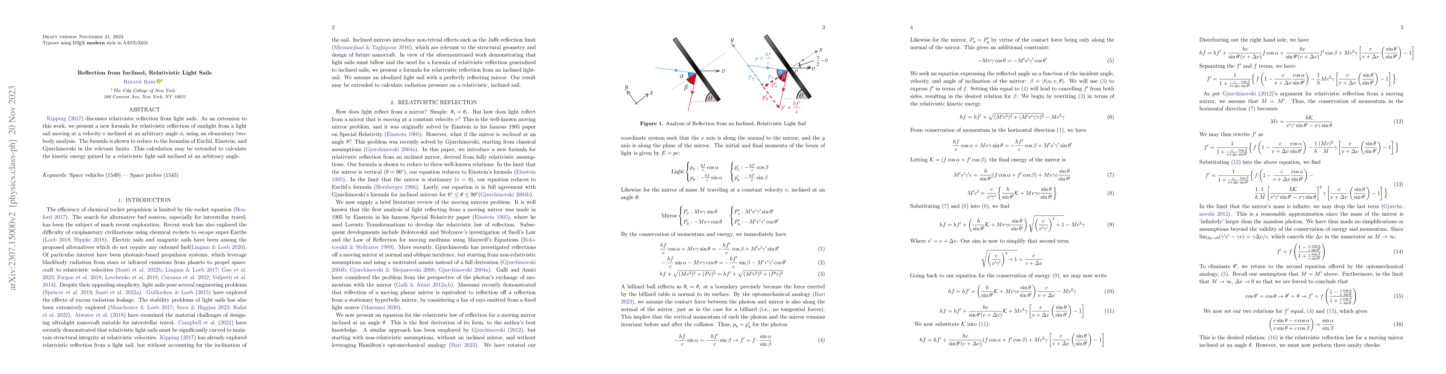 This paper develops a new formula for relativistic reflection of sunlight from an inclined light sail, extending previous work by Kipping (2017). It uses a two-body analysis to derive the formula, which reduces to classical and relativistic precedents in specific cases.