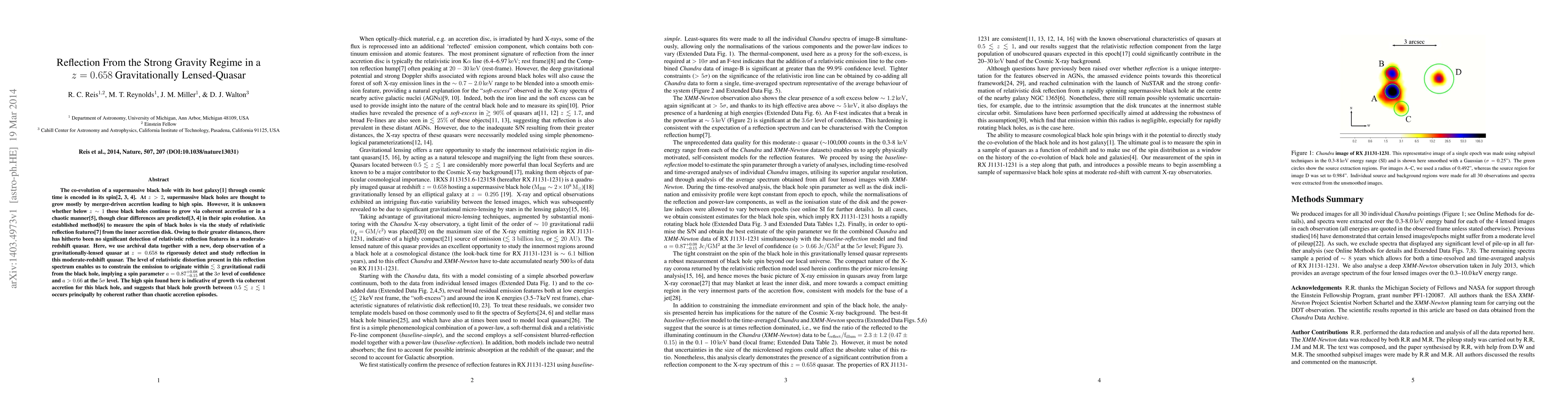 The co-evolution of a supermassive black hole with its host galaxy through cosmic time is encoded in its spin. At $z>2$, supermassive black holes are thought to grow mostly by merger-driven accretion leading to high spin. However, it is unknown whether below $z\sim1$ these black holes continue to grow via coherent accretion or in a chaotic manner, though clear differences are predicted in their spin evolution. An established method to measure the spin of black holes is via the study of relativistic reflection features from the inner accretion disk. Owing to their greater distances, there has hitherto been no significant detection of relativistic reflection features in a moderate-redshift quasar. Here, we use archival data together with a new, deep observation of a gravitationally-lensed quasar at $z=0.658$ to rigorously detect and study reflection in this moderate-redshift quasar. The level of relativistic distortion present in this reflection spectrum enables us to constrain the emission to originate within $\lesssim3$ gravitational radii from the black hole, implying a spin parameter $a=0.87^{+0.08}_{-0.15} $ at the $3\sigma$ level of confidence and $a>0.66$ at the $5\sigma$ level. The high spin found here is indicative of growth via coherent accretion for this black hole, and suggests that black hole growth between $0.5\lesssim z \lesssim 1$ occurs principally by coherent rather than chaotic accretion episodes.