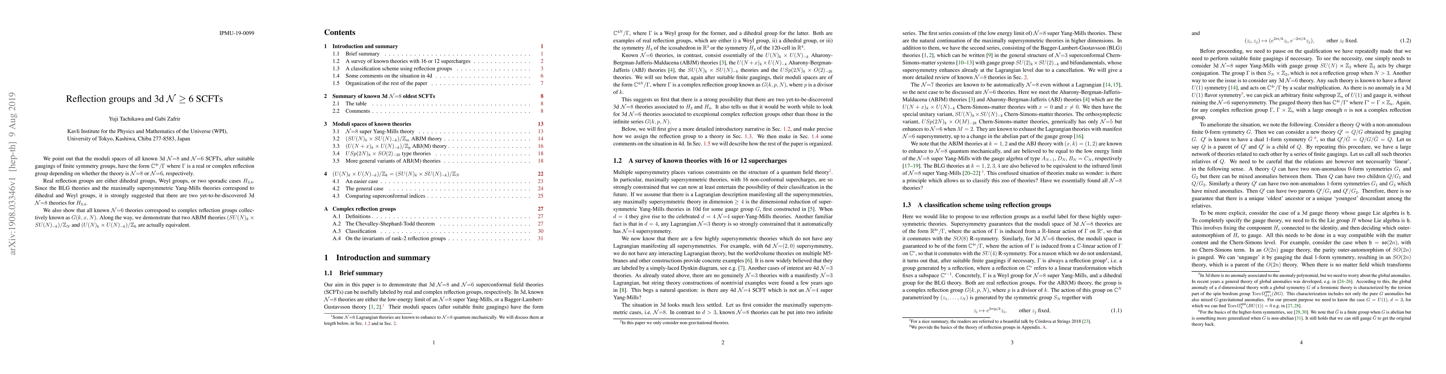 We point out that the moduli spaces of all known 3d $\mathcal{N}=$ 8 and $\mathcal{N}=$ 6 SCFTs, after suitable gaugings of finite symmetry groups, have the form $\mathbb{C}^{4r}/\Gamma$ where $\Gamma$ is a real or complex reflection group depending on whether the theory is $\mathcal{N}=$ 8 or $\mathcal{N}=$ 6, respectively. Real reflection groups are either dihedral groups, Weyl groups, or two sporadic cases $H_{3,4}$. Since the BLG theories and the maximally supersymmetric Yang-Mills theories correspond to dihedral and Weyl groups, it is strongly suggested that there are two yet-to-be-discovered 3d $\mathcal{N}=$ 8 theories for $H_{3,4}$. We also show that all known $\mathcal{N}=$ 6 theories correspond to complex reflection groups collectively known as $G(k,x,N)$. Along the way, we demonstrate that two ABJM theories $(SU(N)_k\times SU(N)_{-k})/\mathbb{Z}_N$ and $(U(N)_k\times U(N)_{-k})/\mathbb{Z}_k$ are actually equivalent.